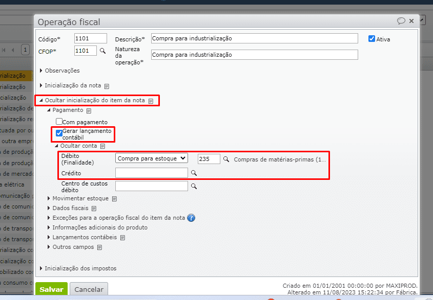 3) Na edição da operação fiscal, expanda o menu “Inicialização do item da nota”.