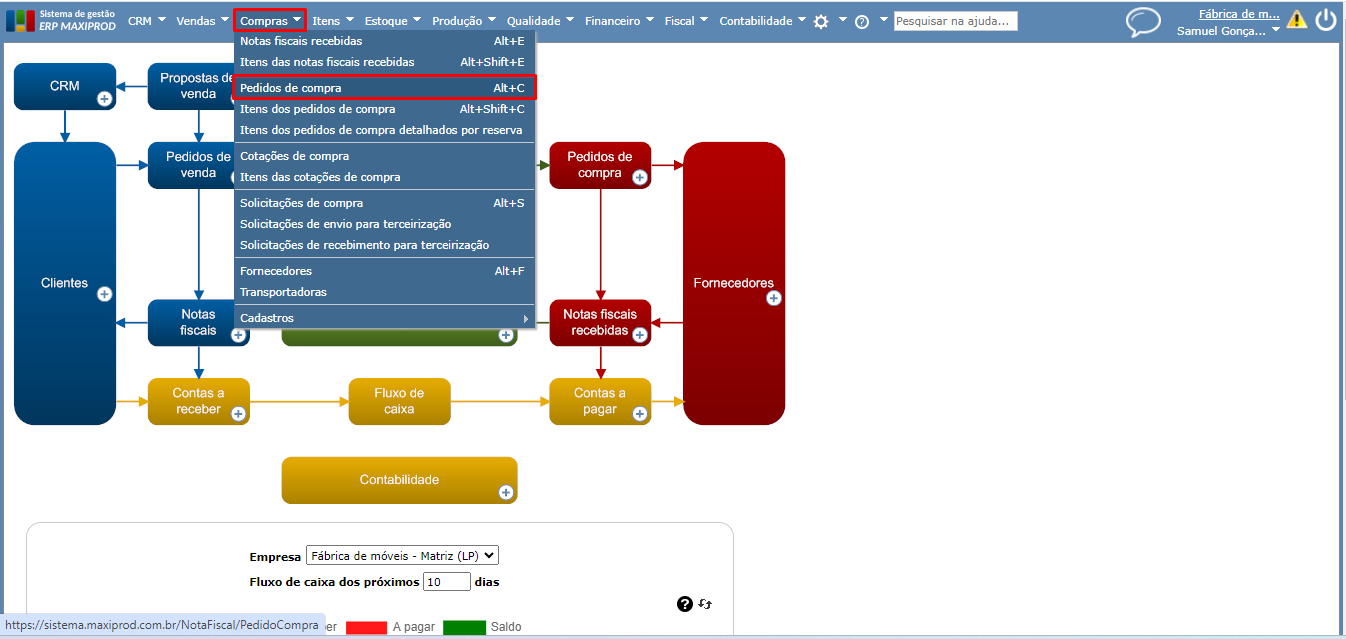 Recebido: todos os produtos foram recebidos. Não são considerados em fluxo de caixa, limite de crédito e MRP.