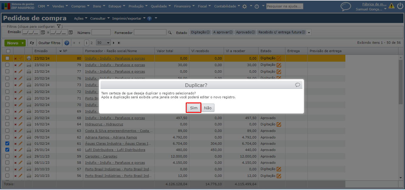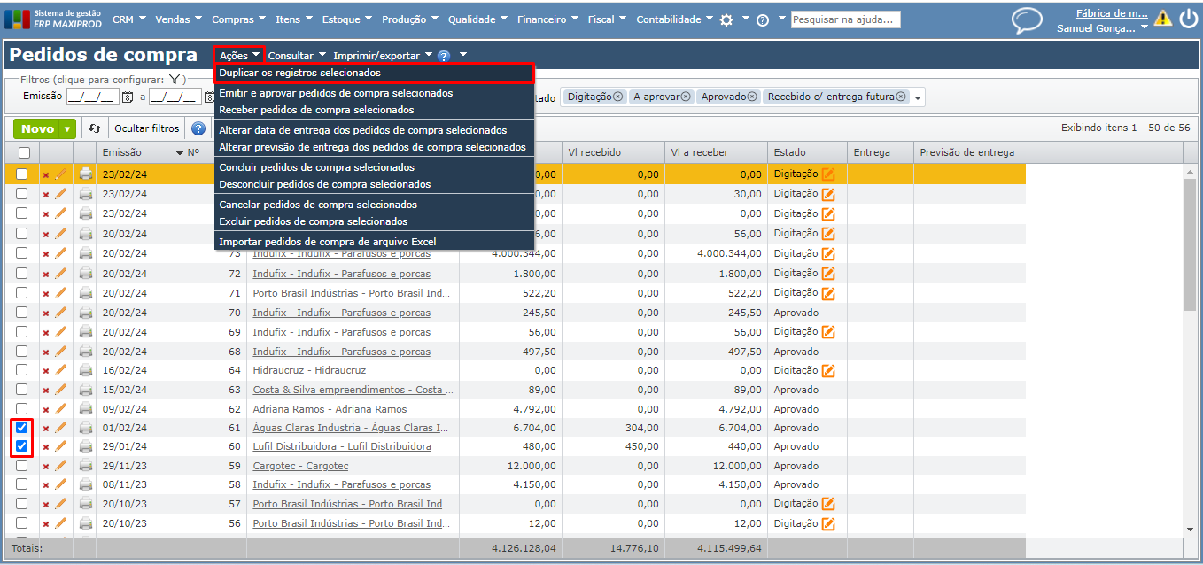 2) Na grade de pedidos de compra, selecione o(s) pedido(s) que deseja duplicar, independente do seu estado atual, e clique em “Ações > Duplicar os registros selecionados”.