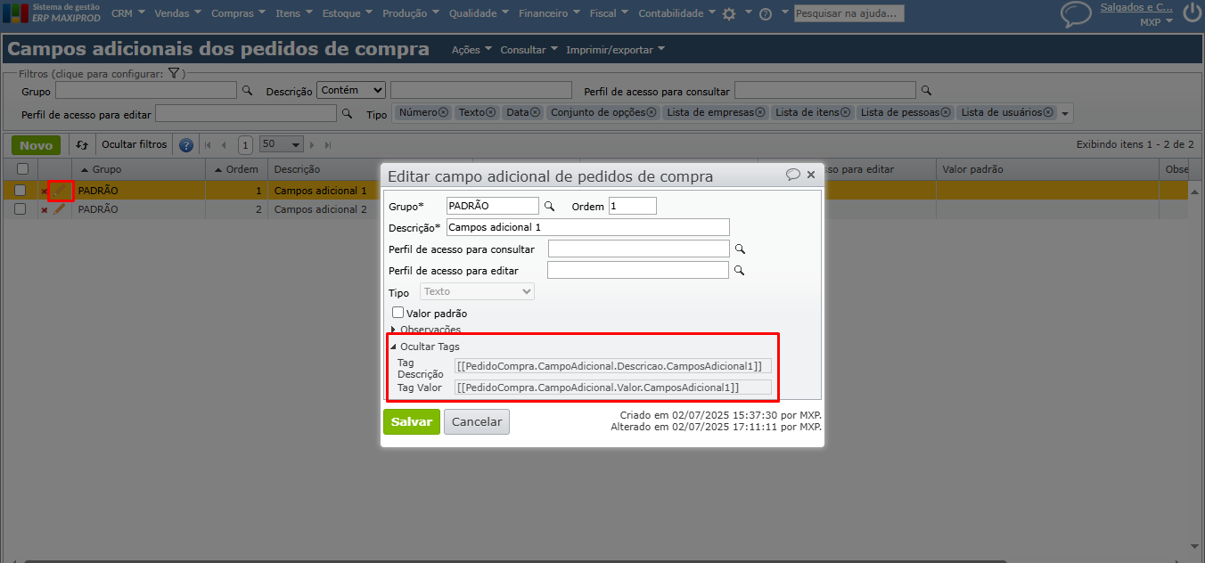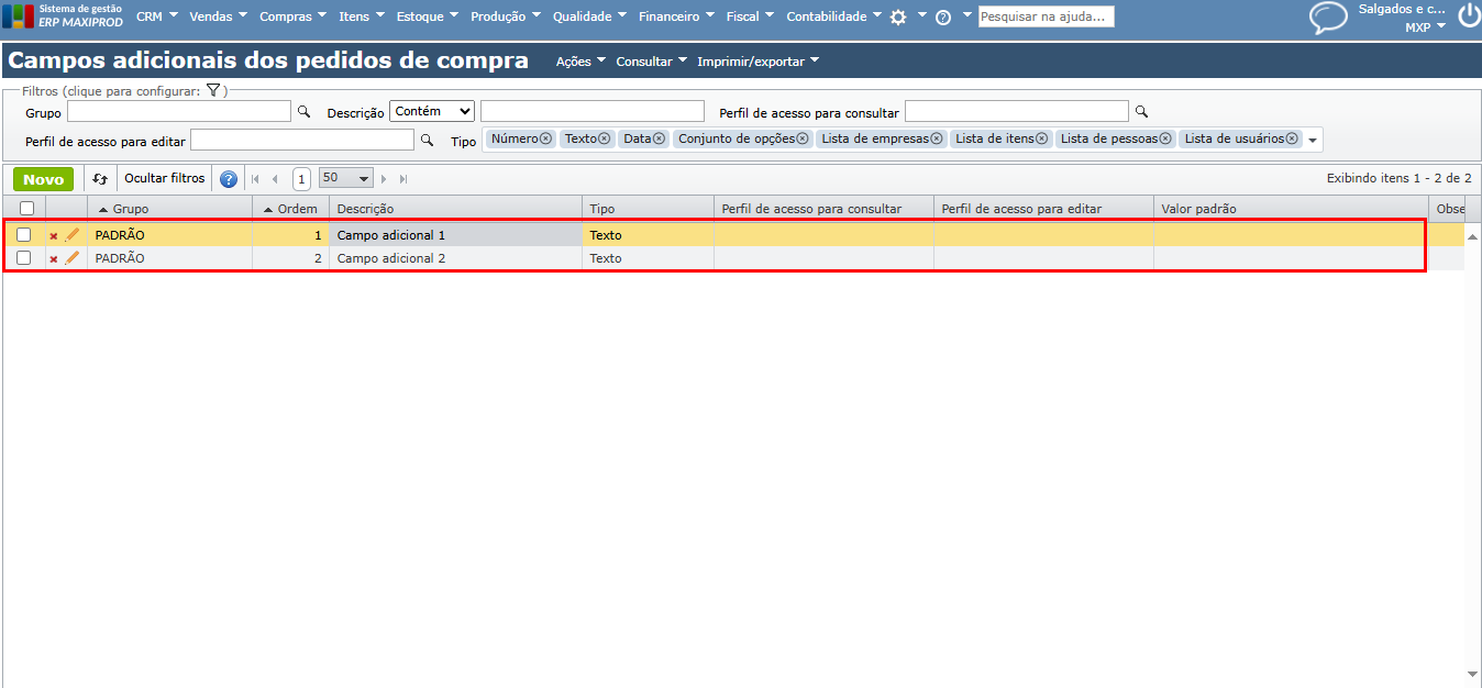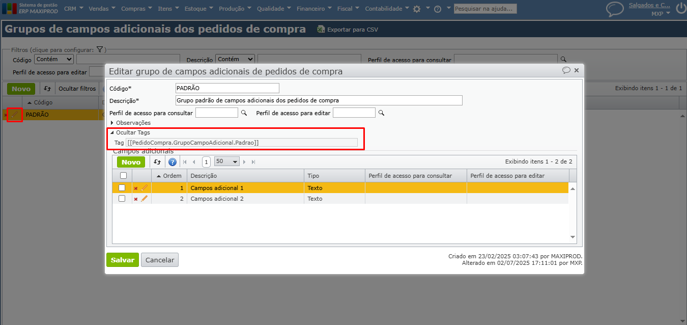 1) Utilizando como exemplo o grupo com a descrição “Grupo padrão de campos adicionais dos pedidos de compra” e os campos adicionais vinculados a esse grupo, “Campo adicional 1” e “Campo adicional 2”.
