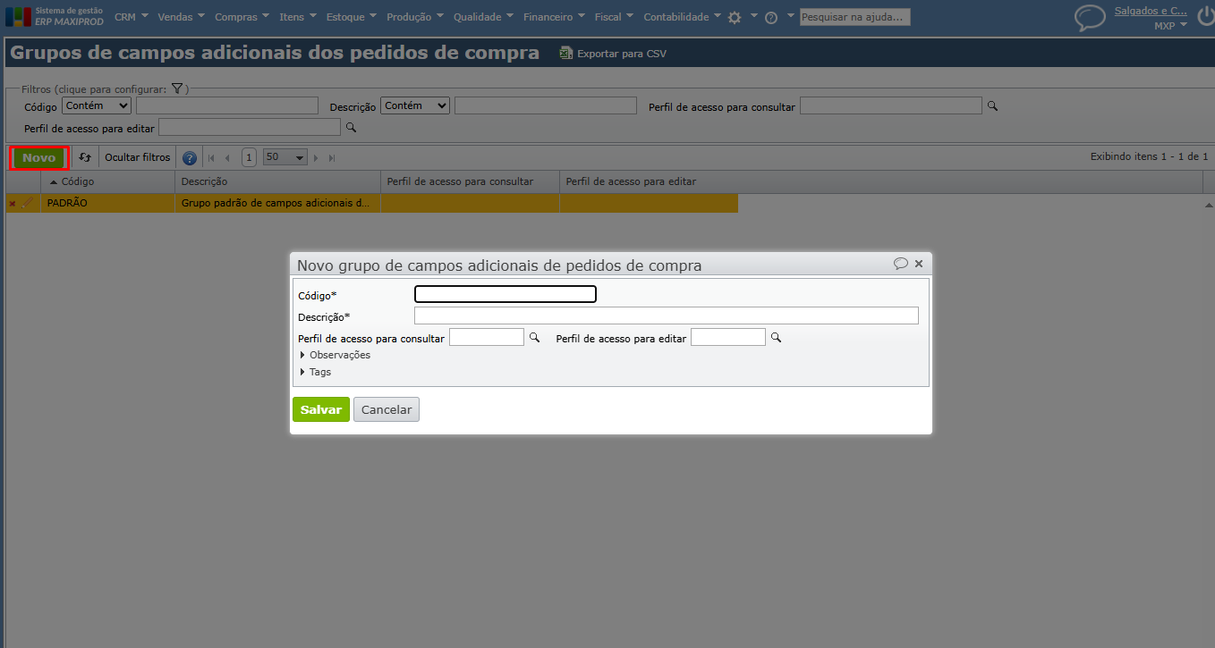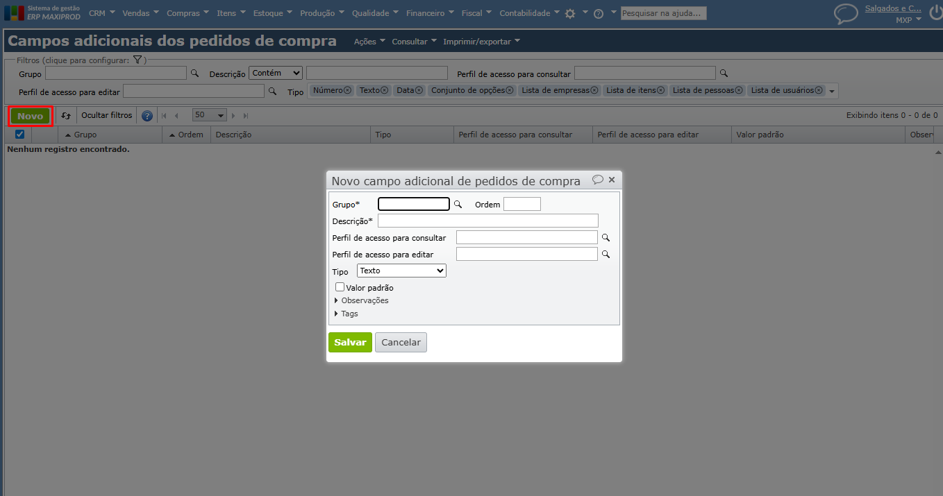 Após o cadastramento, os grupos e campos adicionais passam a ser exibidos na tela de edição de todos os pedidos de compra, respeitando os perfis de acesso definidos no cadastro do grupo, conforme o tópico “Funcionamento dos perfis de acesso para consulta e edição”.