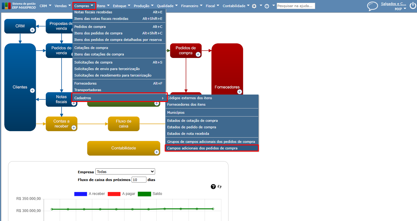 a) Acesse o menu “Compras > Cadastros > Campos adicionais dos pedidos de compra”.