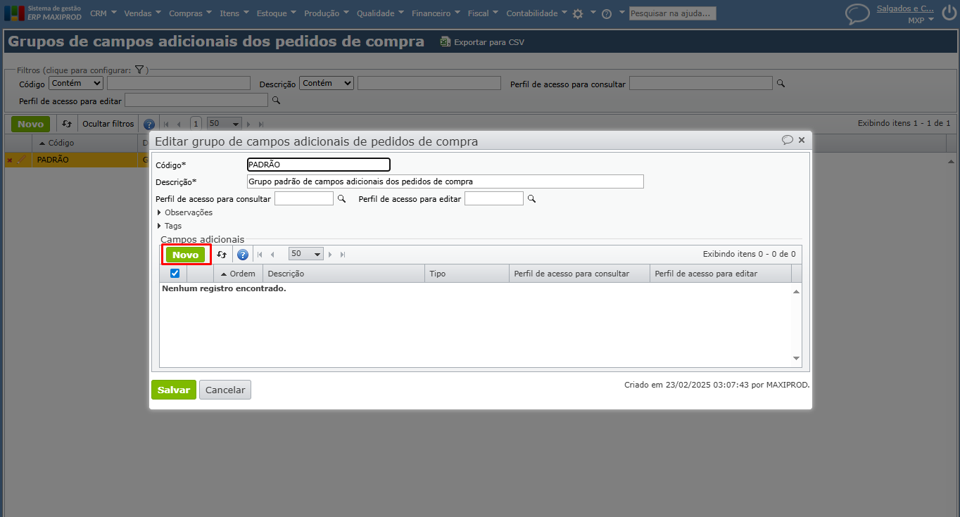 a) Cadastro do grupo com descrição “Grupo padrão de campos adicionais dos pedidos de compra”.