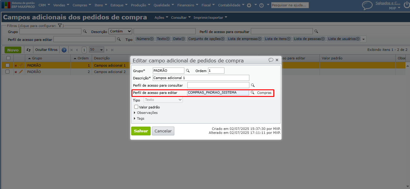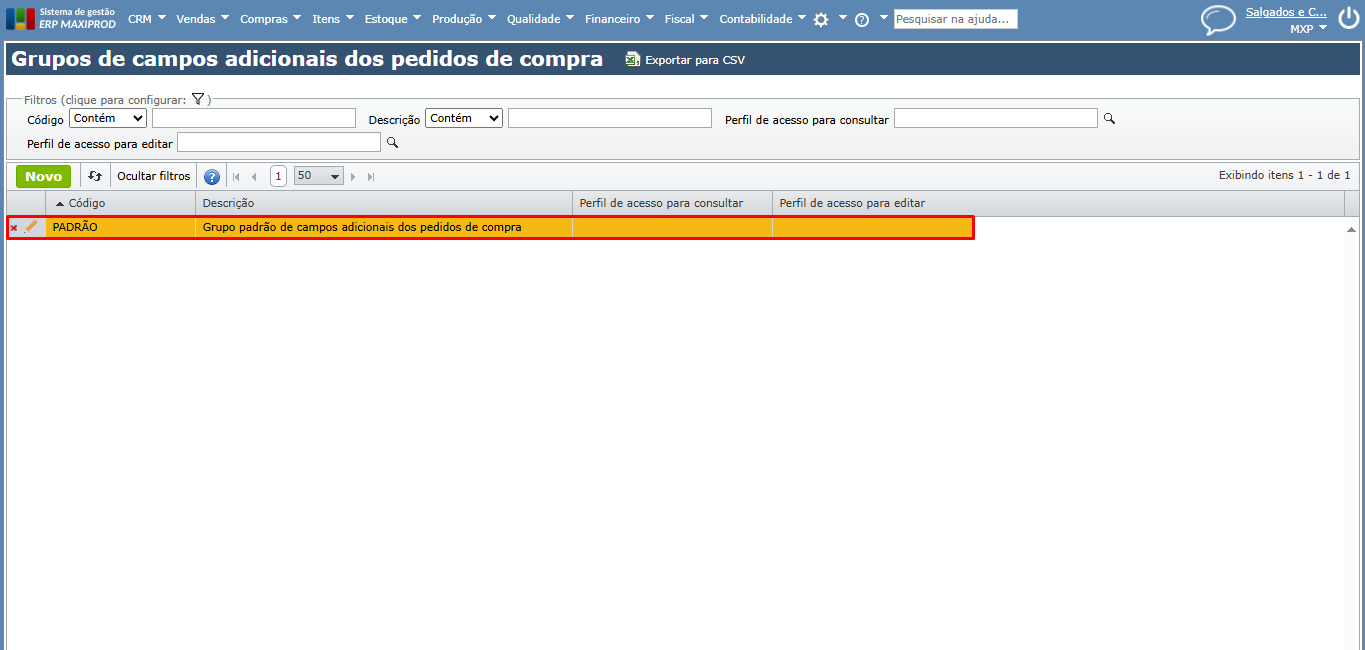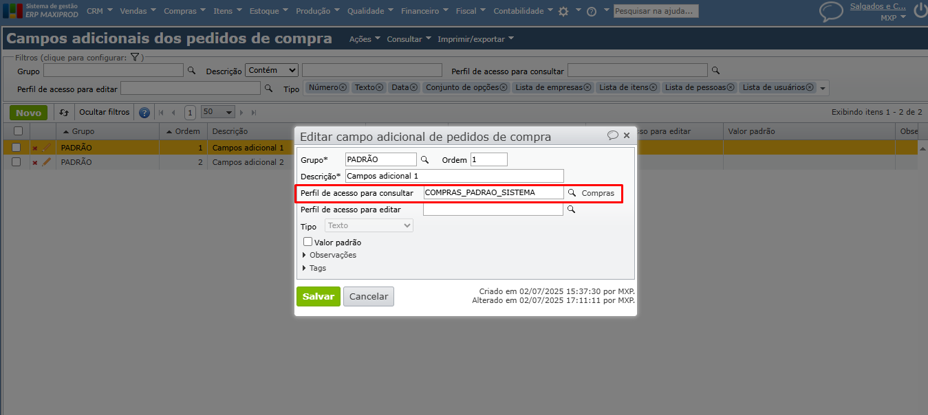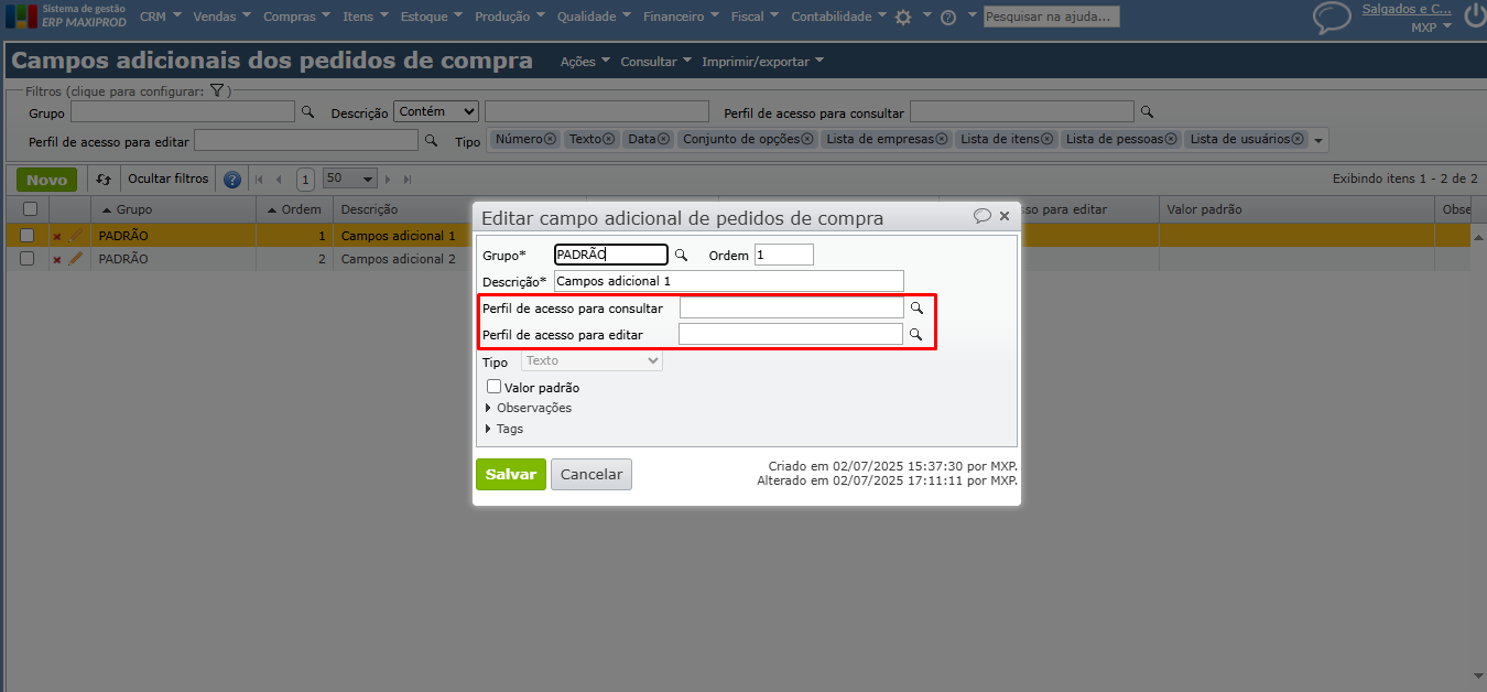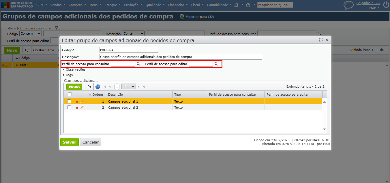 1) Utilizando como exemplo o grupo com a descrição “Grupo padrão de campos adicionais dos pedidos de compra”, os perfis que podem consultar ou editar são preenchidos respectivamente nos campos “Perfil de acesso para consultar” e “Perfil de acesso para editar”.