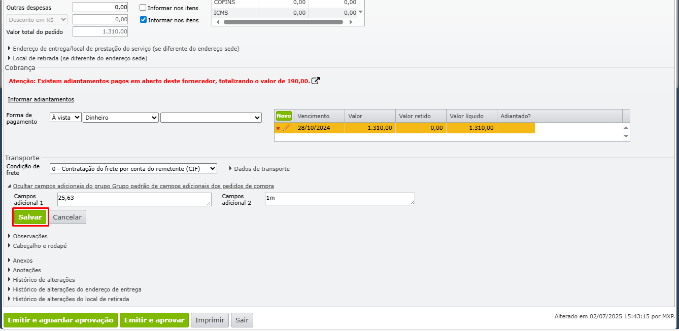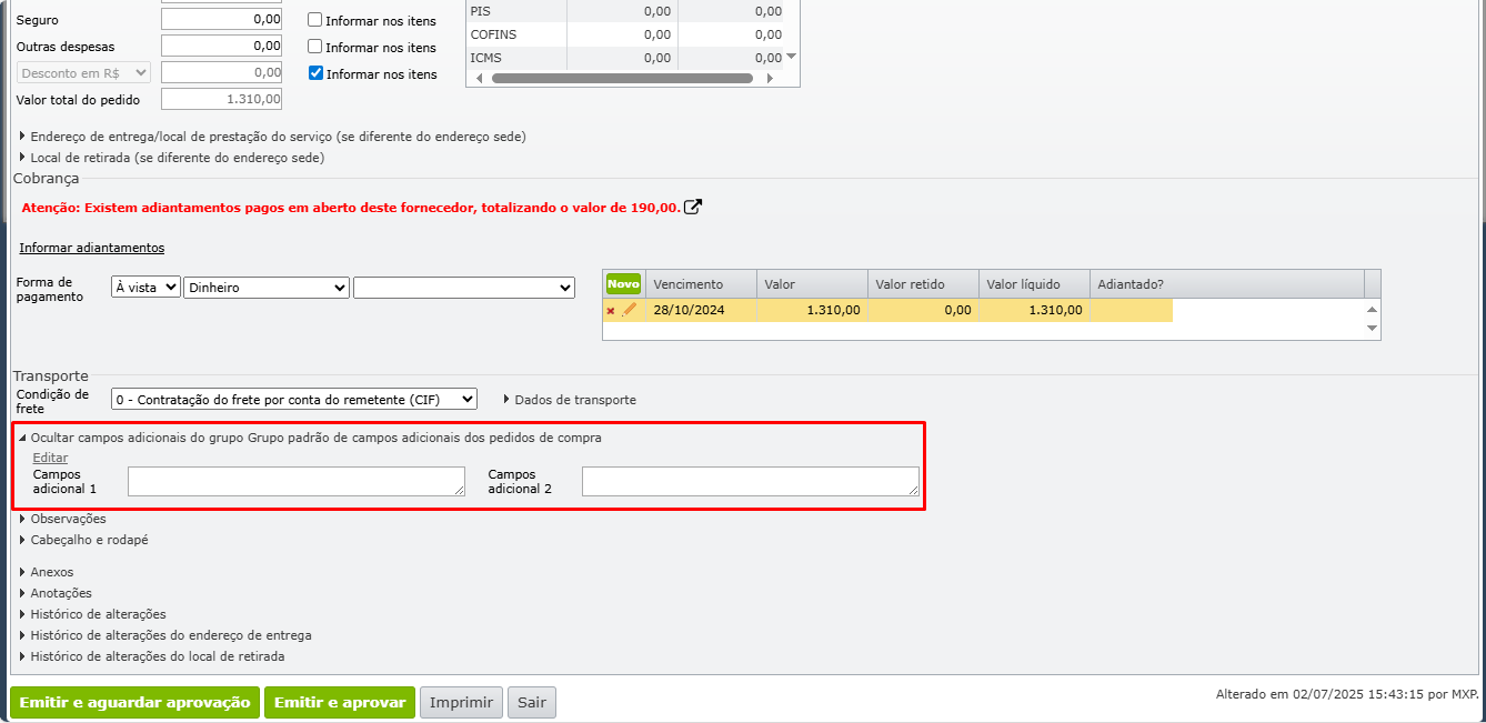 2) Na tela de edição do pedido de compra será apresentada a seção com a mesma descrição do grupo e seus campos adicionais.