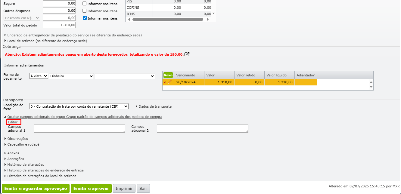 3) Para editar um campo adicional, o pedido de compra deve estar no estado “Digitação”. Assim, basta clicar na opção “Editar”, presente em cada grupo de campos adicionais.