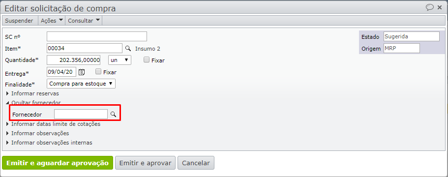 2) Checkbox “Preferencial”: se um item tem um fornecedor preferencial, então este inicializa o campo “Fornecedor” das solicitações de compra (SCs) em estado sugerido, geradas pelo MRP.