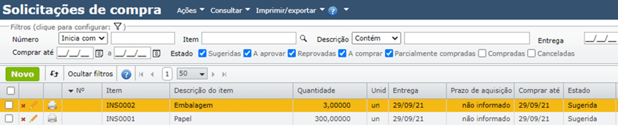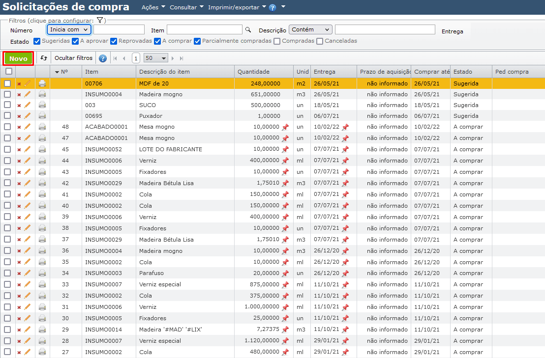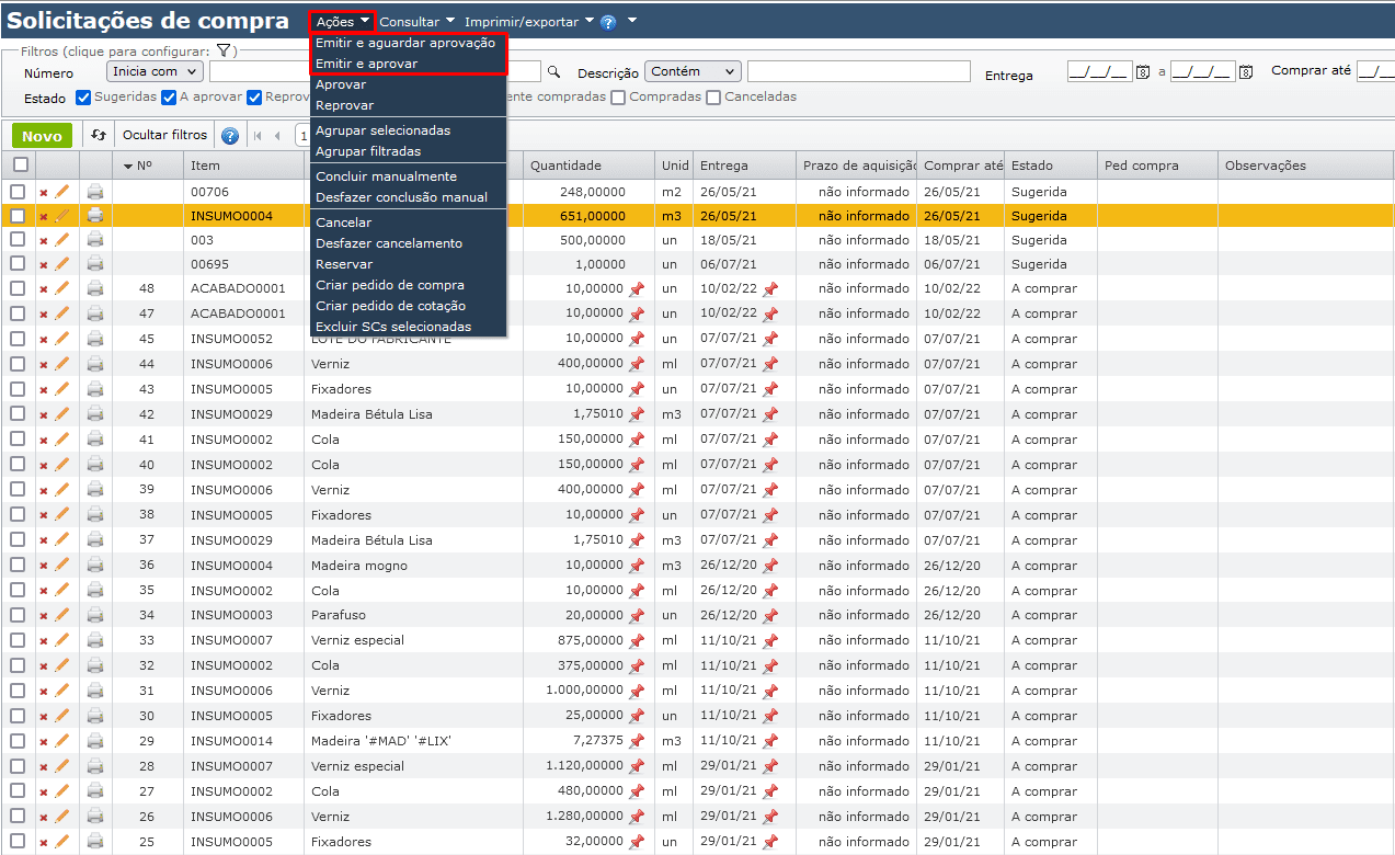 - Sugerida: estado de toda SC sugerida pelo MRP. Neste estado, deve-se analisar a SC e aprová-la (a fim de continuar o fluxo de compras) ou cancelá-la (caso a SC não mais seja oportuna).