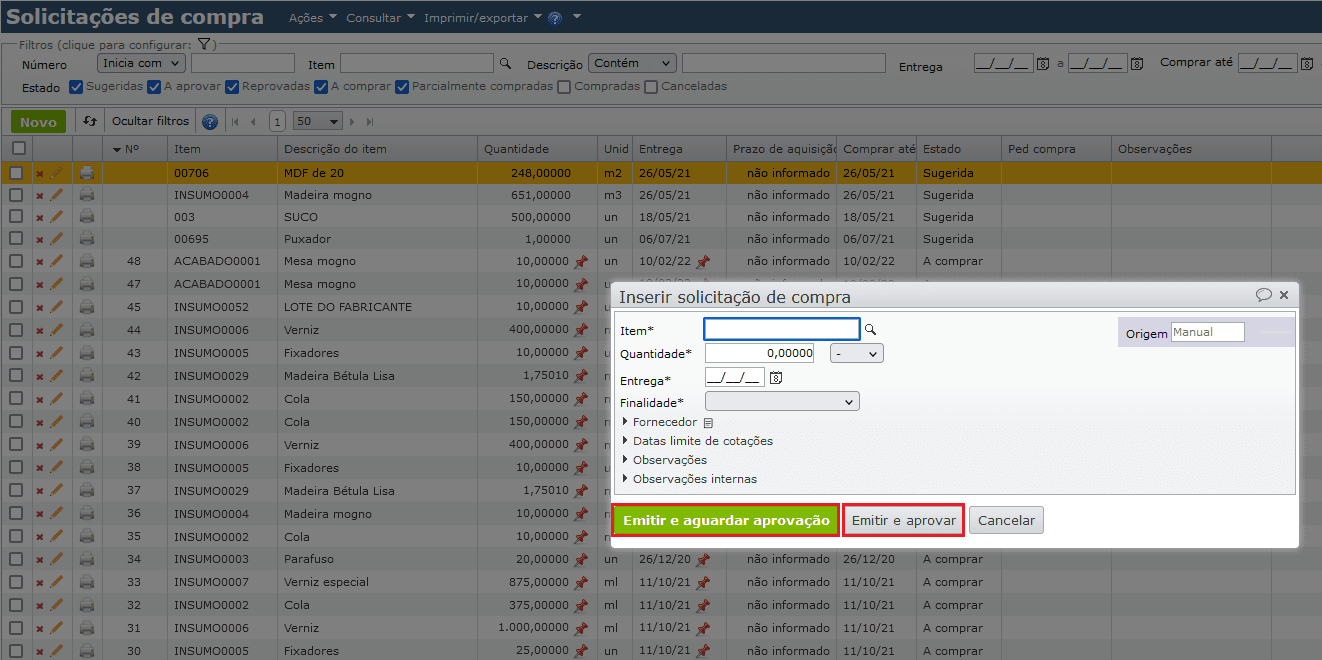 3) Preencha os dados e clique no botão “Emitir e aguardar aprovação” (para apenas emitir a SC no estado Sugerido) ou em “Emitir e aprovar” (para emitir a SC no estado A comprar).