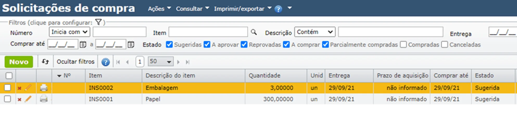 - Sugerida: estado de toda SC sugerida pelo MRP. Neste estado, deve-se analisar a SC e aprová-la (a fim de continuar o fluxo de compras) ou cancelá-la (caso a SC não mais seja oportuna).