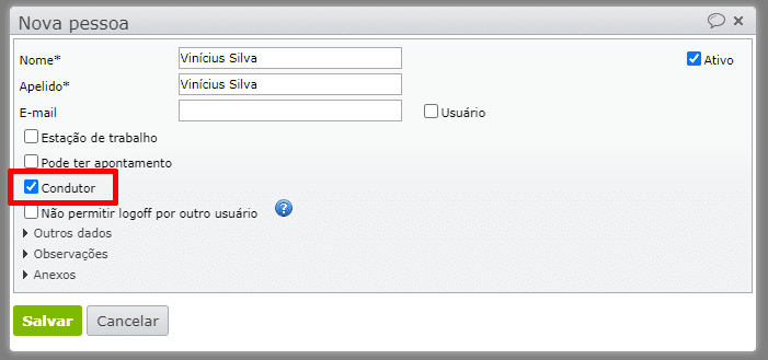 Dica: Se você já possui cadastrado seu motorista como pessoa ou usuário do sistema, basta entrar na edição do cadastro dele e marcar o campo “Condutor”.