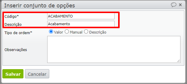 1) Preencha o código, a descrição e clique em “Salvar”.