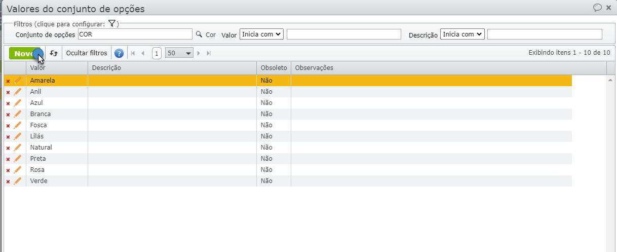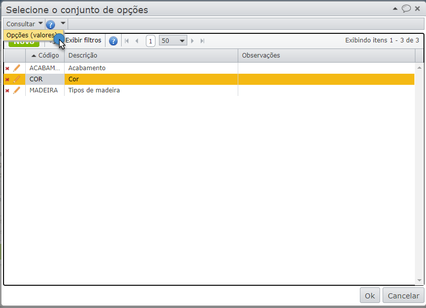 2) Cadastre os valores desse conjunto de opções. Selecione o conjunto e vá ao menu “Consultar” > “Opções (valores)”.