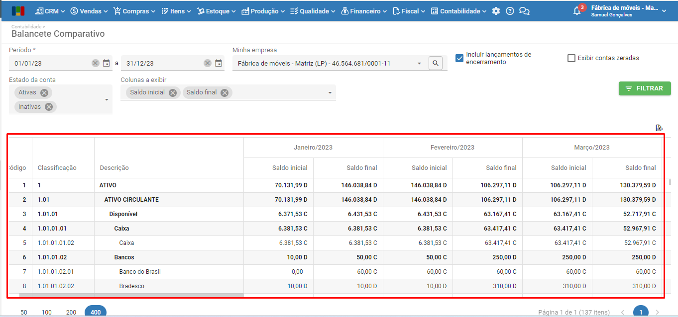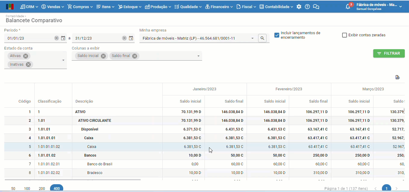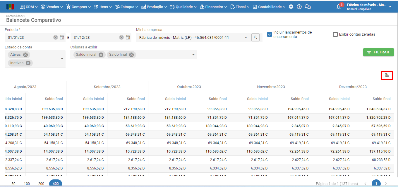 O Balancete Comparativo é uma ferramenta contábil fundamental para comparar a situação das contas contábeis da empresa em diferentes momentos e identificar as variações. É uma tela mais detalhada do que o balancete tradicional, exibindo a posição das contas em intervalos ao longo do período filtrado. Esse formato facilita a análise das variações e tendências nas finanças da empresa já que possibilita uma visão clara das mudanças financeiras ao longo do tempo, auxiliando na tomada de decisões.