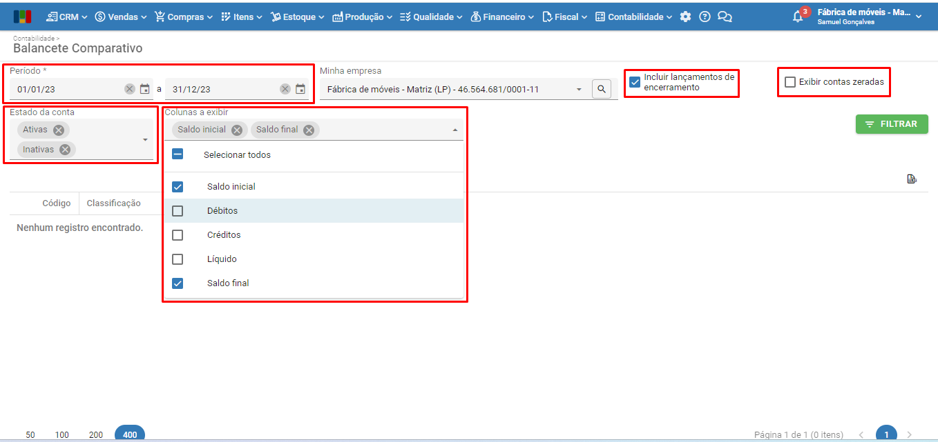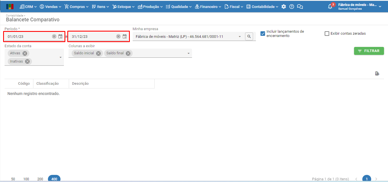 2) Na tela do balancete comparativo, informe o período a exibir, preenchendo o filtro com “Data inicial” e “Data final”.