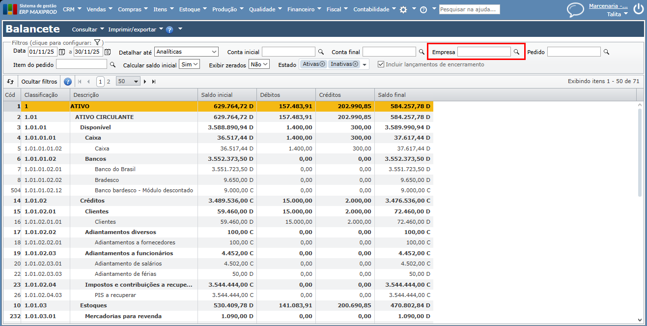 Importante: se o filtro “Empresa” for mantido em branco, o balancete será calculado considerando todas as empresas cadastradas que estejam ativas. Dessa forma, os lançamentos de empresas inativas não serão incluídos no cálculo. Caso deseje visualizar o balancete de uma empresa inativa, selecione essa empresa no filtro “Empresa”
