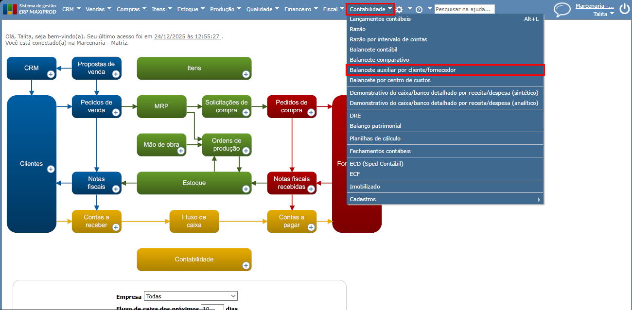 1) Acesse o menu “Contabilidade > Balancete auxiliar por cliente/fornecedor”.