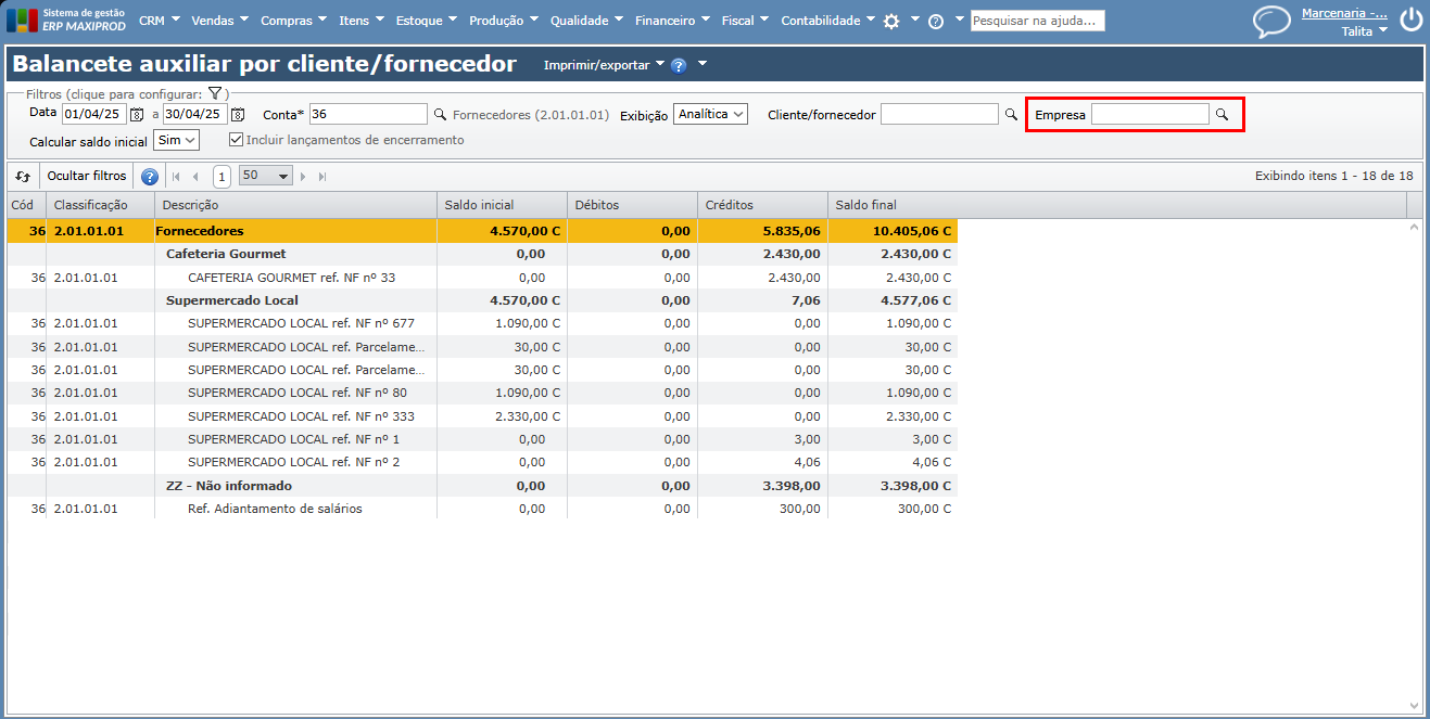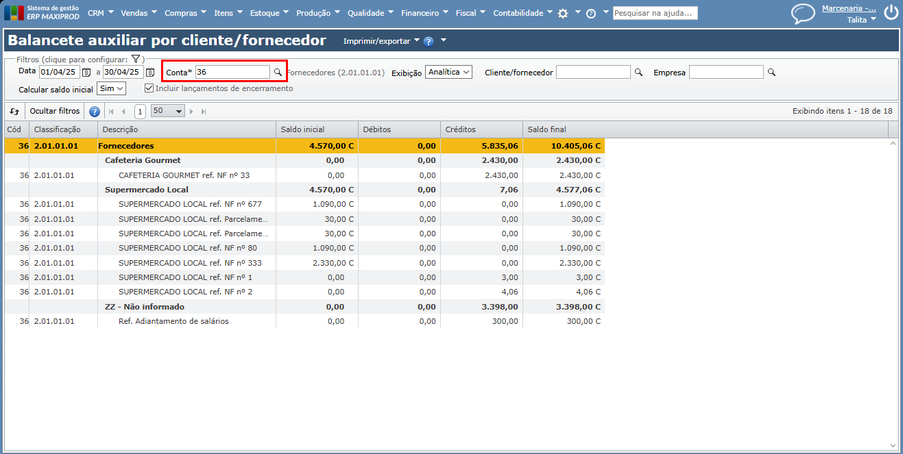 4) É aberta a tela de “Balancete auxiliar por cliente/fornecedor” já filtrada pela conta selecionada.