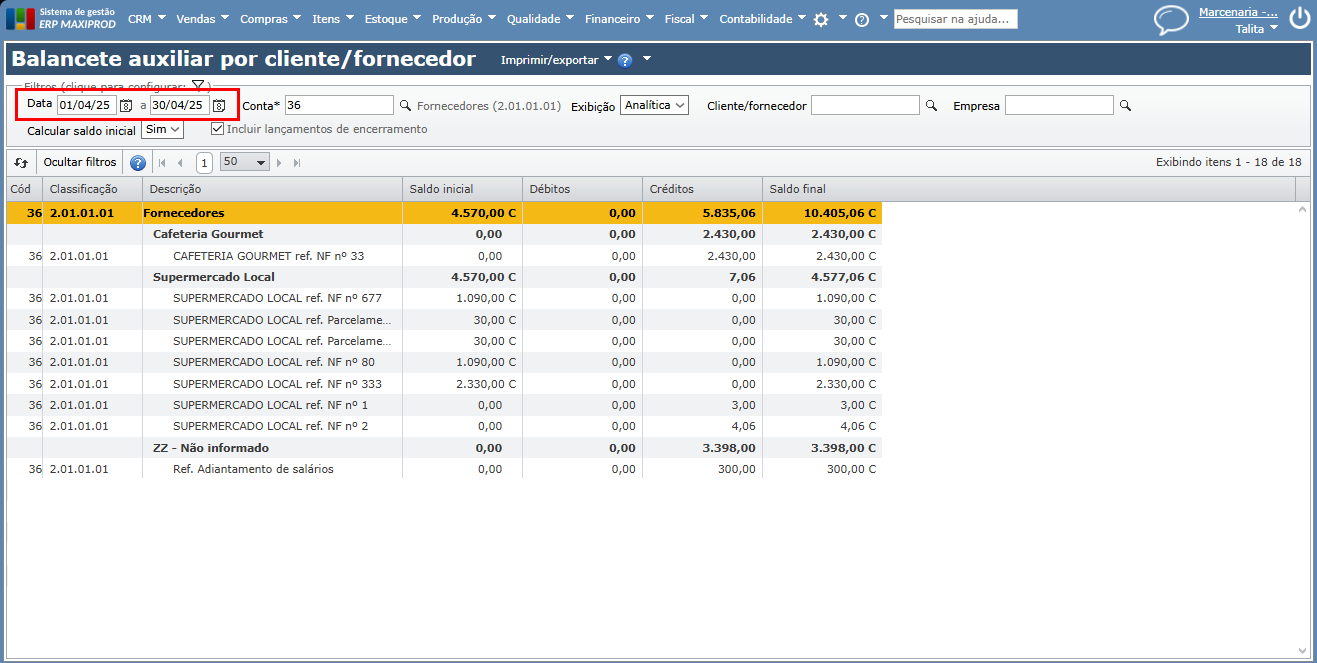 tela de balancete auxiliar por cliente/fornecedor com datas filtradas