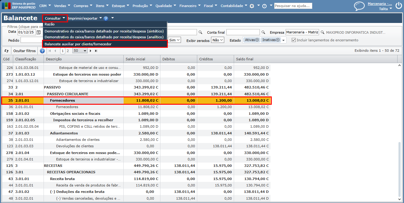 saldo da conta de fornecedores da tela de balancete