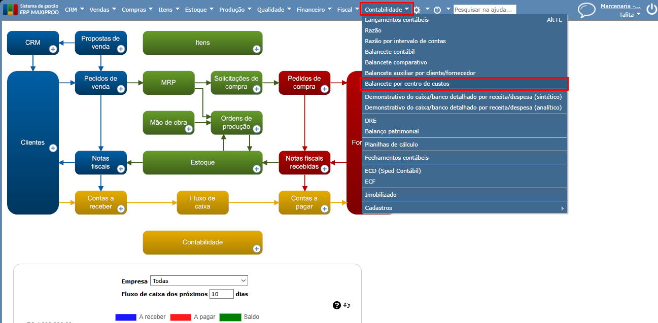 1) Vá ao menu “Contabilidade > Balancete por centro de custos”.