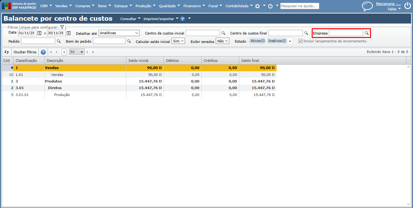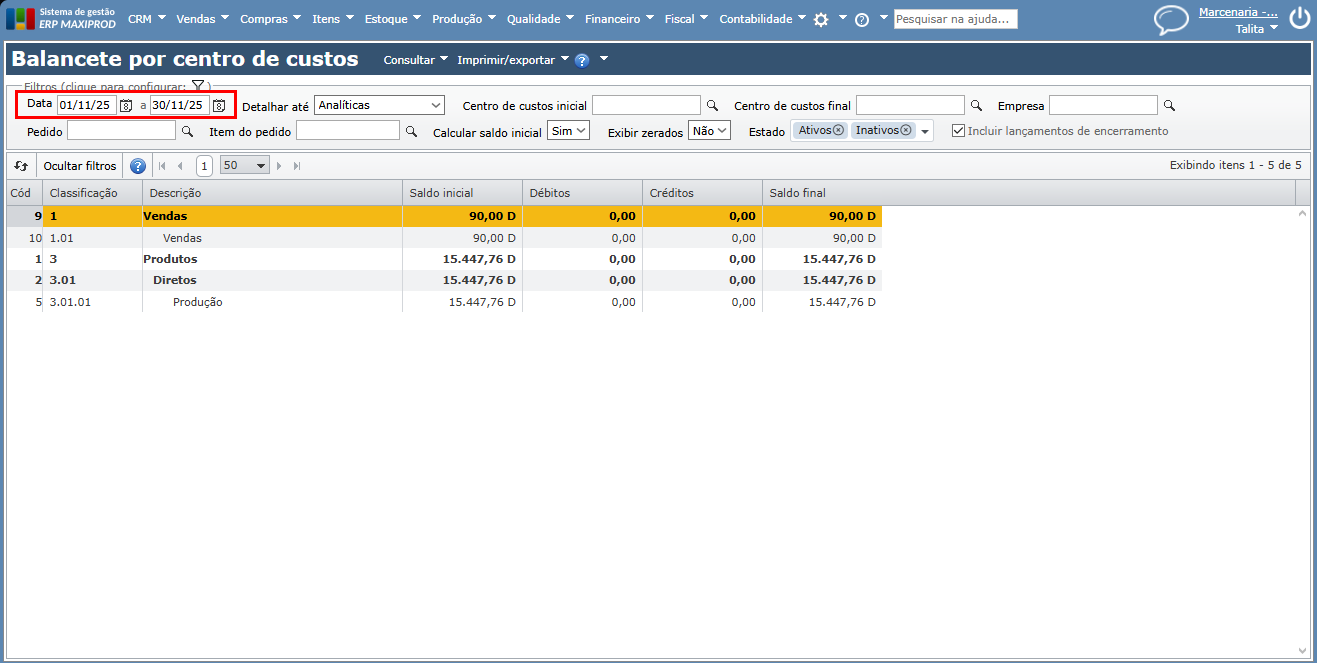 4) São mostrados todos os centros de custos, com seus respectivos valores de saldo inicial, débitos, créditos e saldo final dentro do período de tempo filtrado.