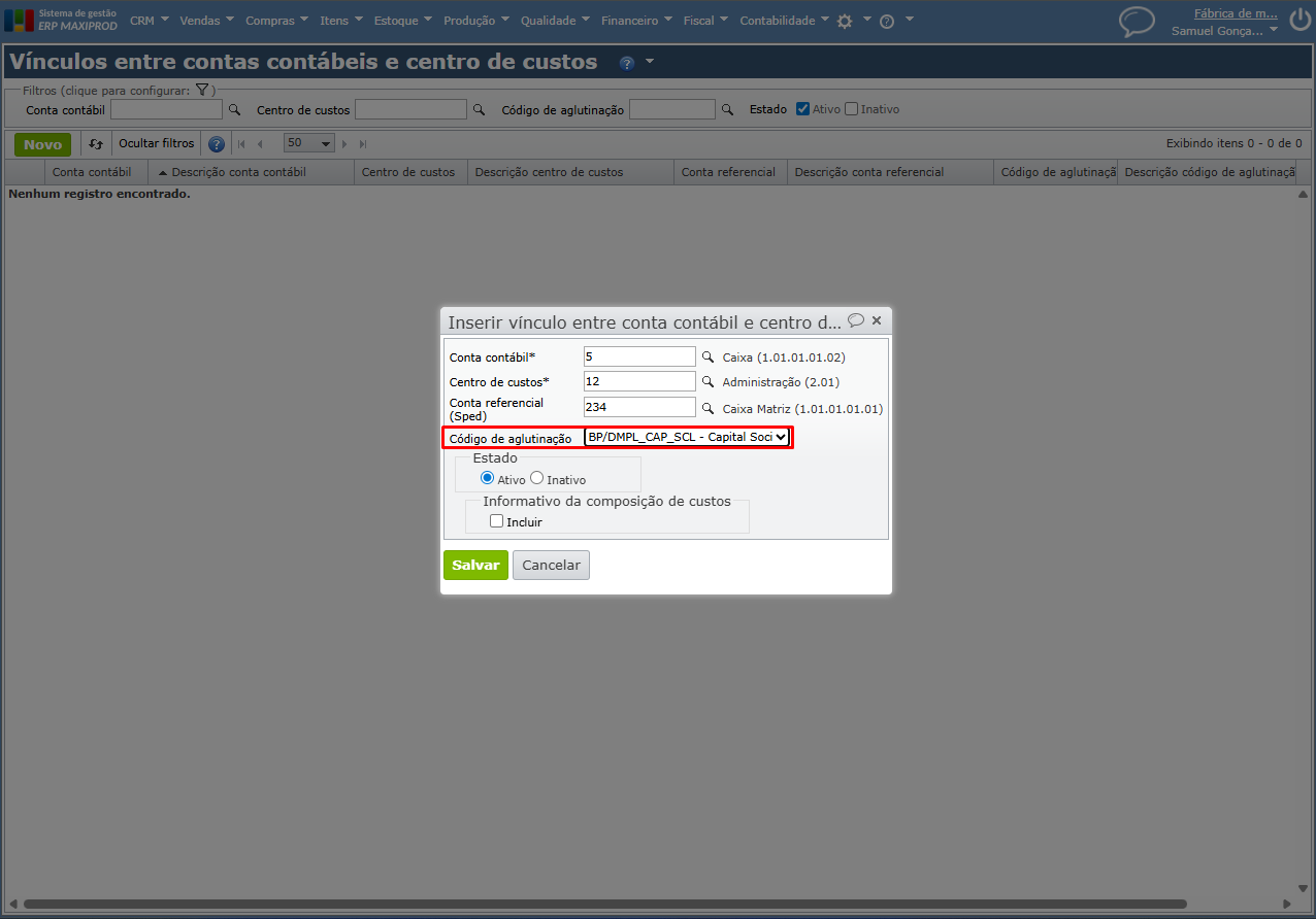 4) Para atribuir um código de aglutinação a vínculo entre contas contábeis e centro de custos, vá ao menu “Contabilidade > Cadastros > Vínculos entre contas contábeis e centro de custos”.