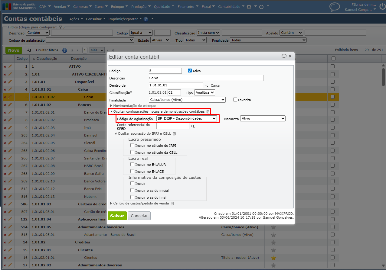 b) Na tela de edição de uma conta contábil, há um campo “Código de aglutinação” cujas opções foram previamente cadastradas. Preencha ou altere conforme necessário e clique em “Salvar”.
