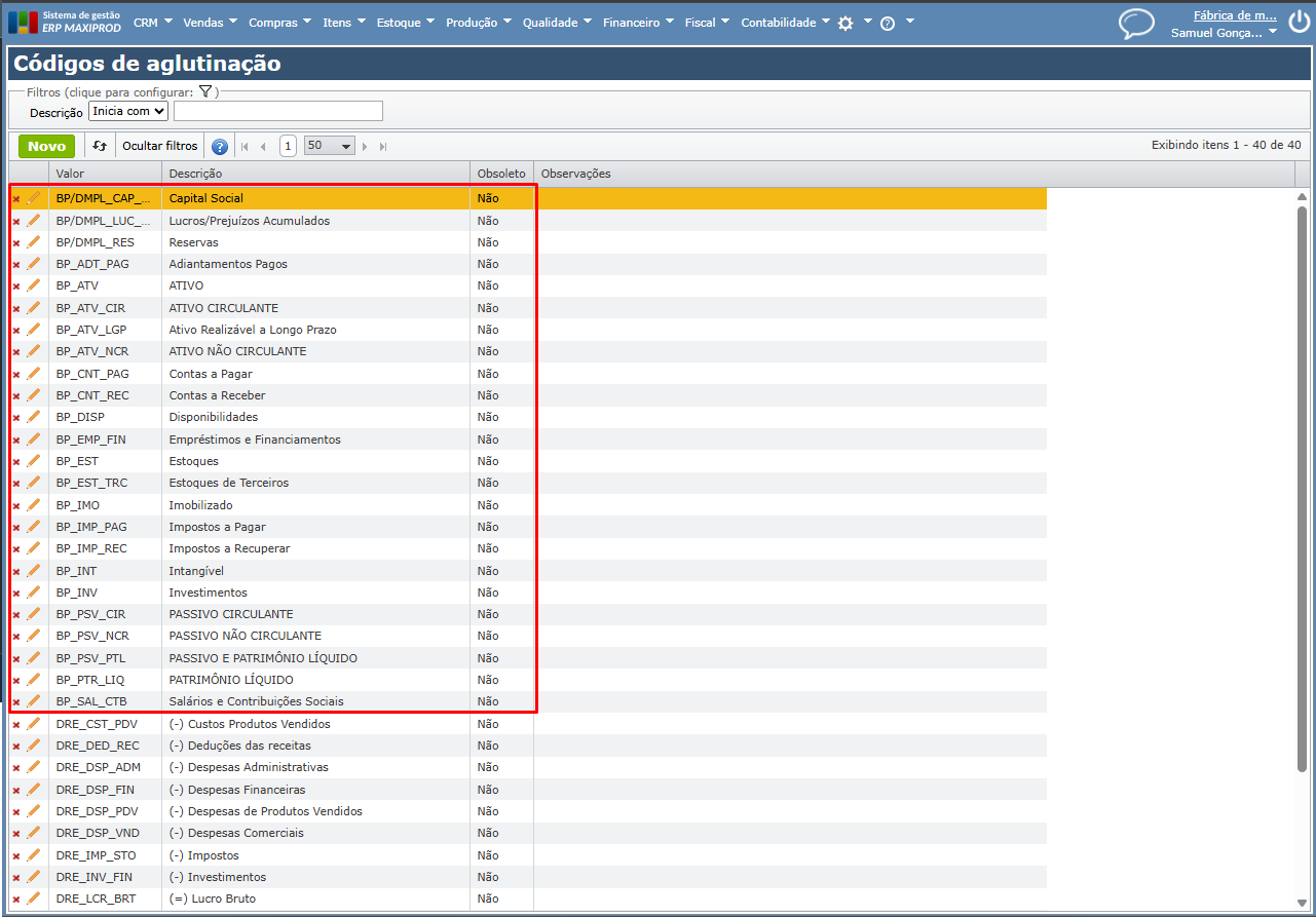 No ERP MAXIPROD, o código de aglutinação é utilizado para agrupar saldos contábeis de maneira personalizada, permitindo consolidar valores de diferentes contas (ou combinações de conta com centro de custos) sob um mesmo identificador.