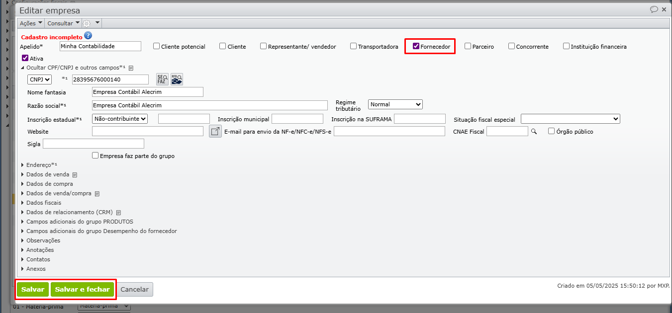 3) Após preencher o contador e/ou a empresa contadora, clique em “Salvar” ou “Salvar e fechar” ao final da tela.