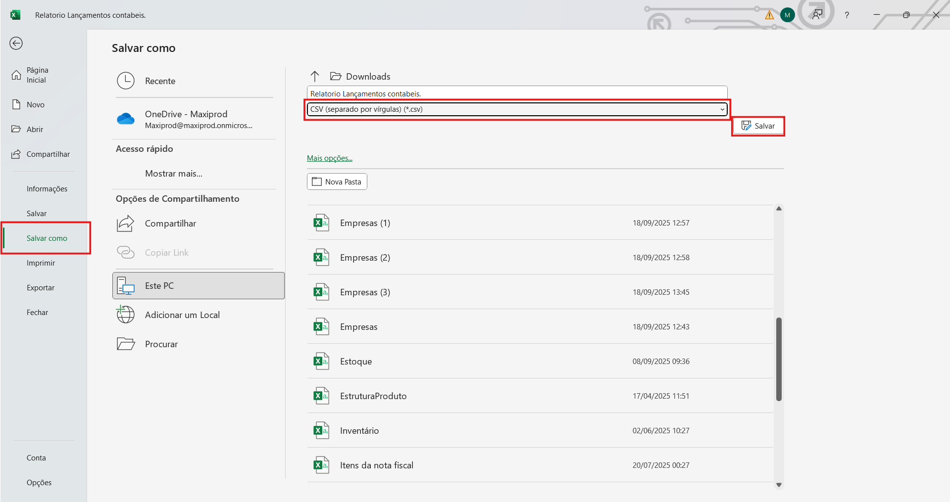 2) Abra a planilha exportada (.xlsx), vá para “Arquivo > Salvar como” e selecione o formato CSV (separado por vírgulas). Salve o arquivo clicando em “Salvar”.