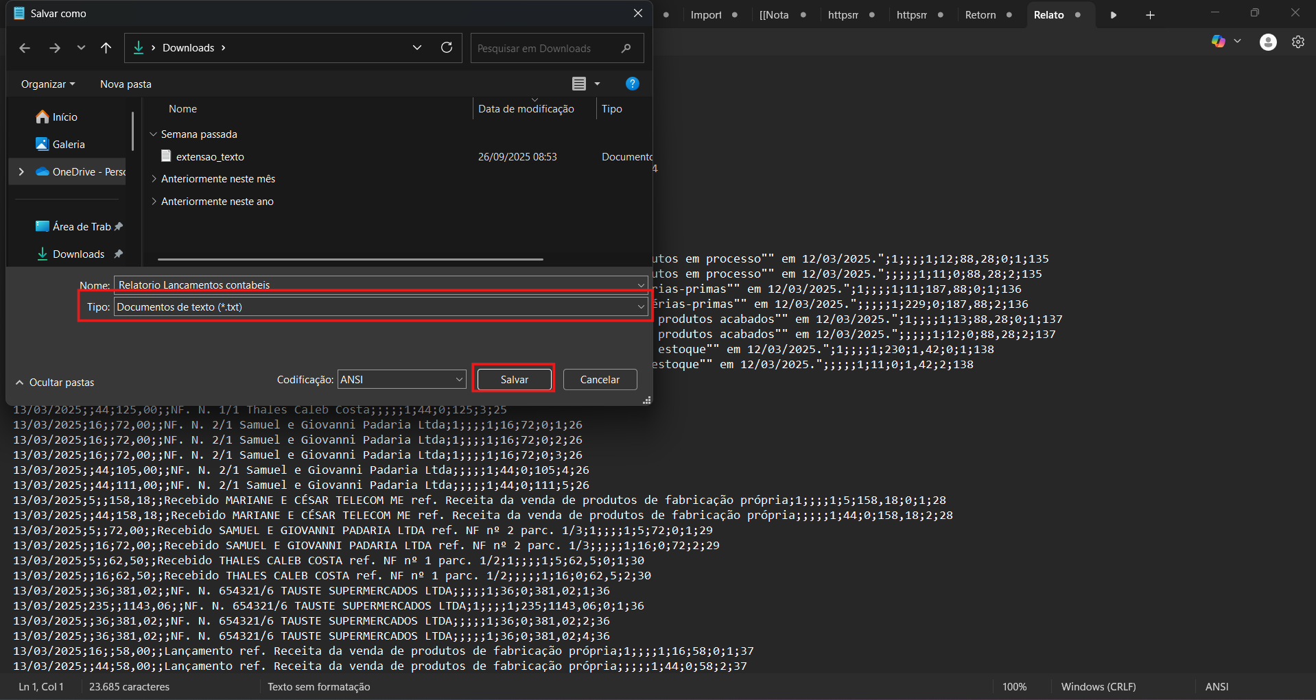 4) Salve as alterações, alterando a extensão do arquivo para .txt.