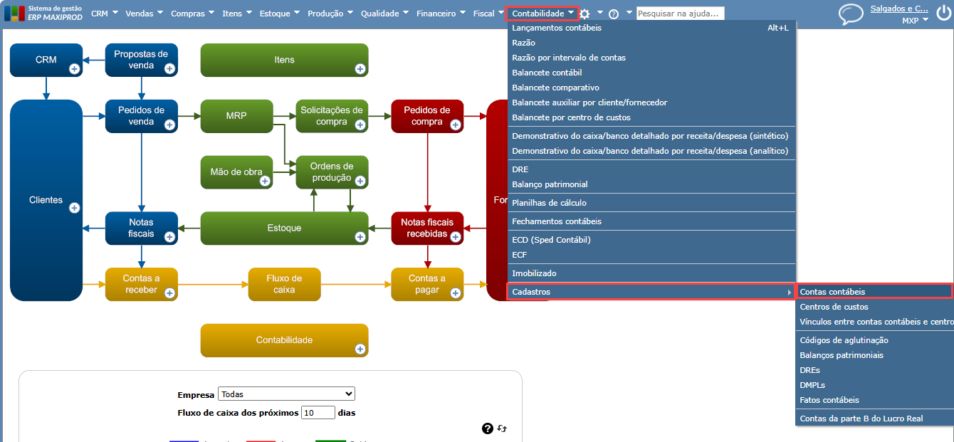 1) Acesse o menu superior “Contabilidade > Cadastros > Contas contábeis”.