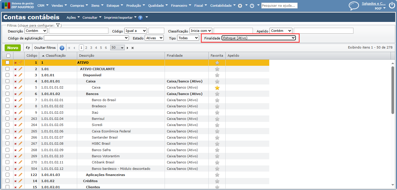 2) Na tela de contas contábeis, utilize o filtro “Finalidade” e busque por contas da finalidade “Estoque (Ativo)”.
