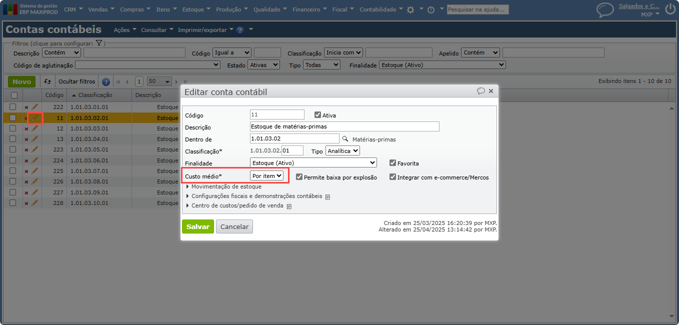 3) Localize a conta que deseja editar (neste caso utilizaremos a conta “Matéria-prima” como exemplo), clique no ícone do lápis. Na tela de edição, no campo “Custo médio”, defina se será “Por item” ou “Por lote”.