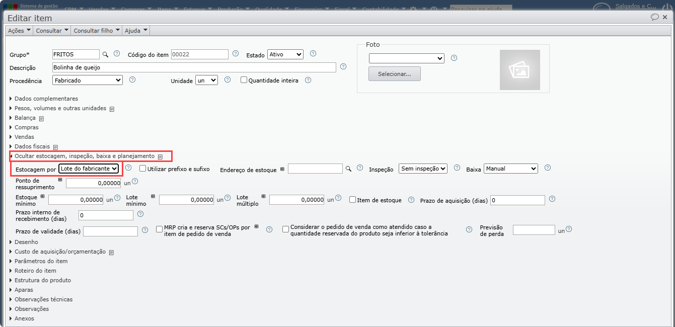 - A forma de estocagem do item precisa ser por “Lote interno”, “Lote do fabricante” ou “Número de série”.