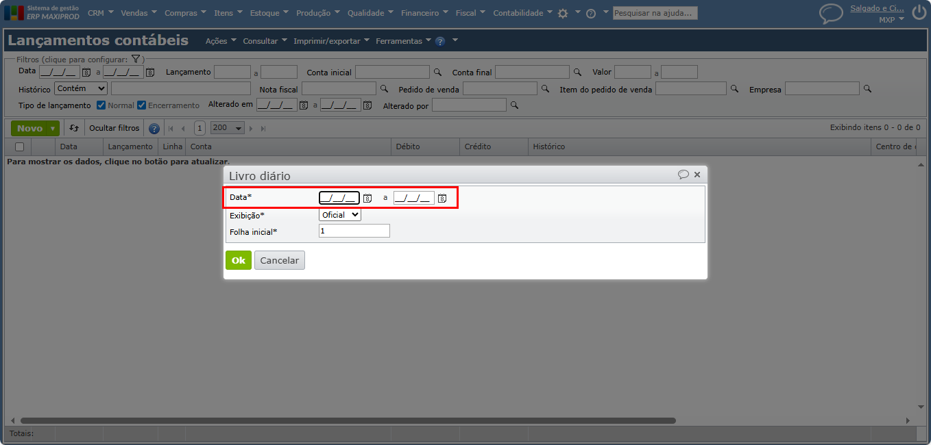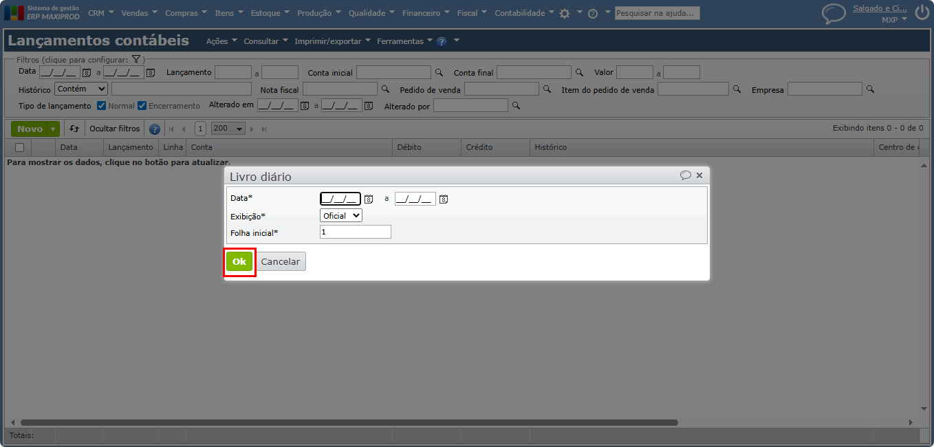 No ERP MAXIPROD, é possível gerar o Livro Diário de forma prática, selecionando o período desejado.