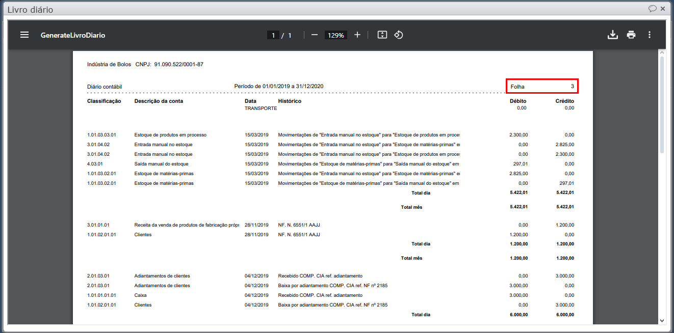 - O sistema emite somente as páginas com lançamentos contábeis. Caso sejam necessárias páginas adicionais, consulte a contabilidade.