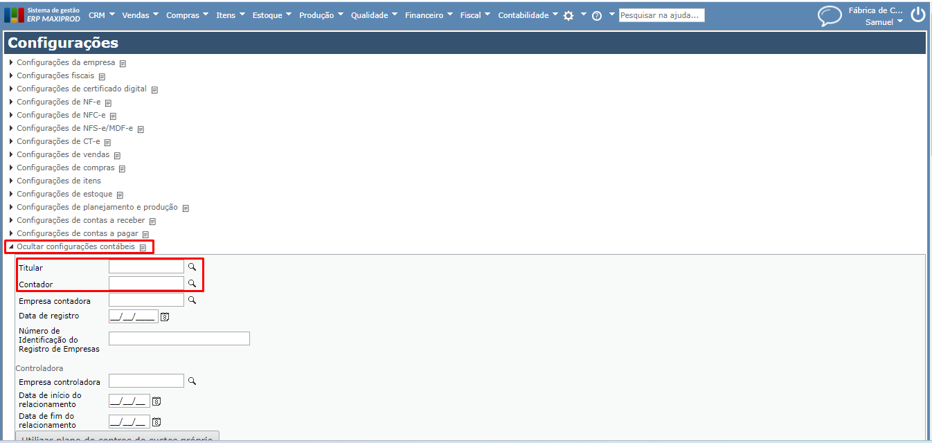 3) Preencha os dados do contador e do titular da empresa, na seção “Configurações Contábeis”.