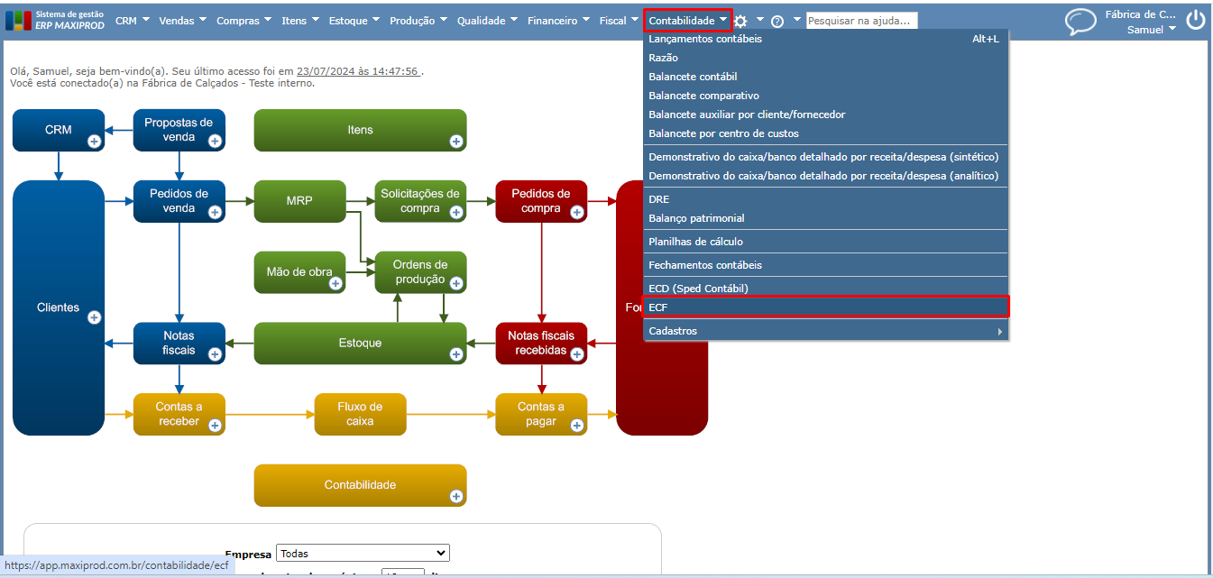1) Após criar as apurações necessárias, acesse ao menu superior “Contabilidade > ECF”.