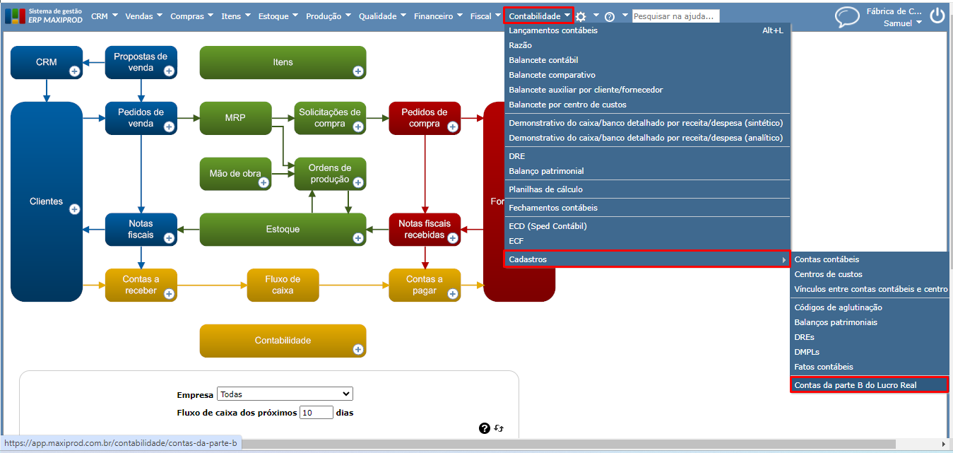 1) Clique no menu superior “Contabilidade > Cadastros > Contas da parte B do Lucro Real”.