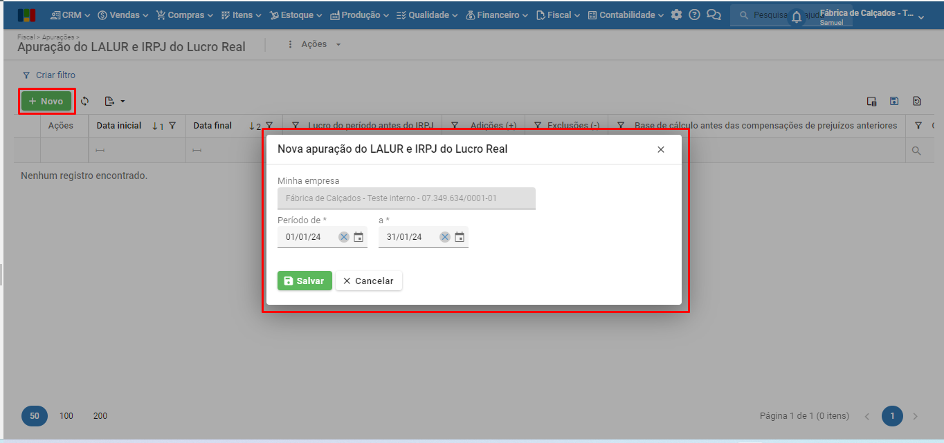2) Clique no botão verde “+ Novo” para criar uma nova apuração. A seguir, preencha o período da apuração, e clique em “Salvar”.