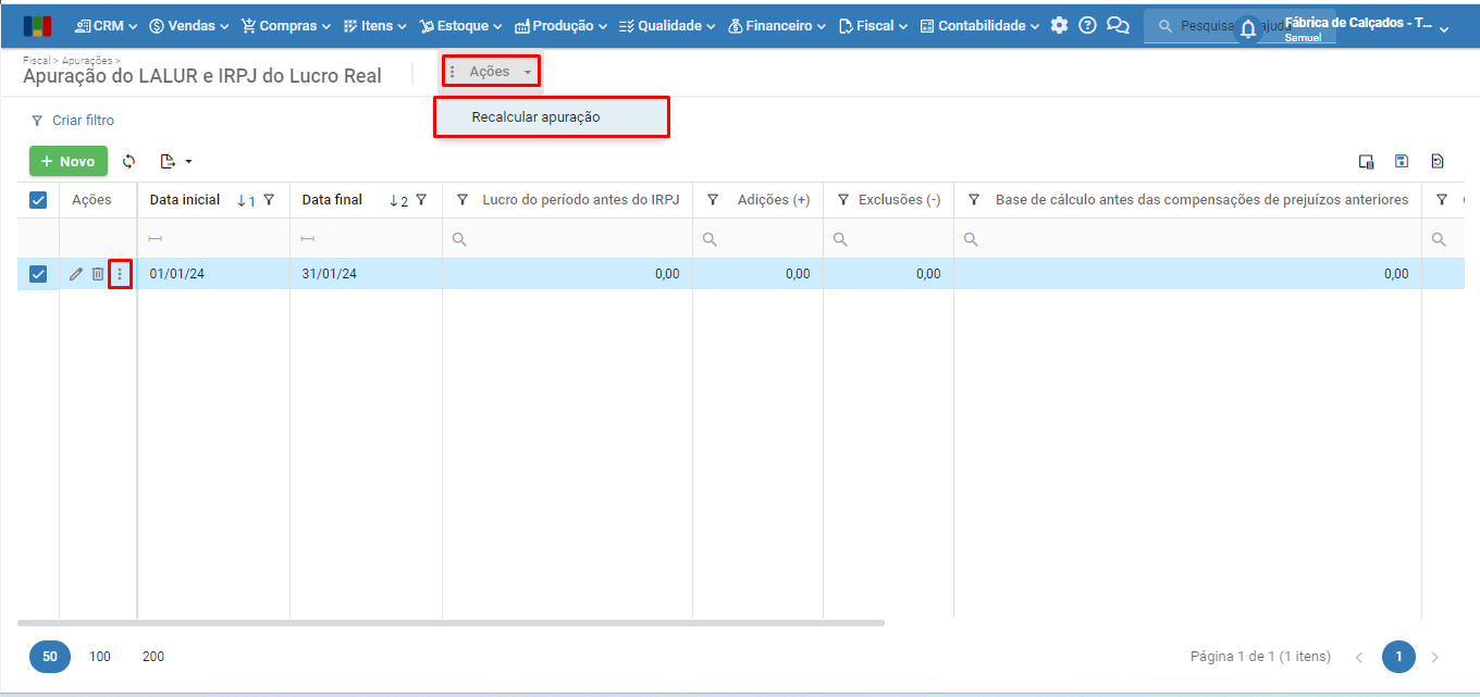 1) Clique no menu superior “Fiscal > Apurações > LALUR e IRPJ do Lucro Real”.