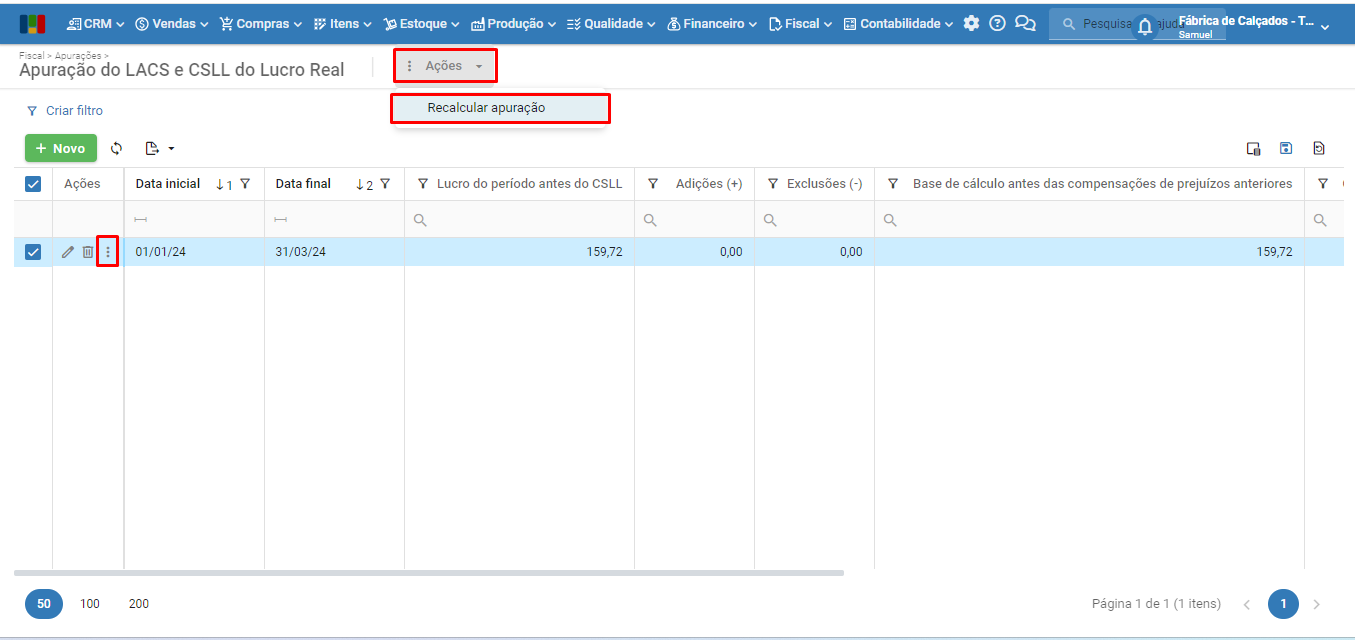 1) Clique no menu superior “Fiscal > Apurações > LACS e CSLL do Lucro Real”.