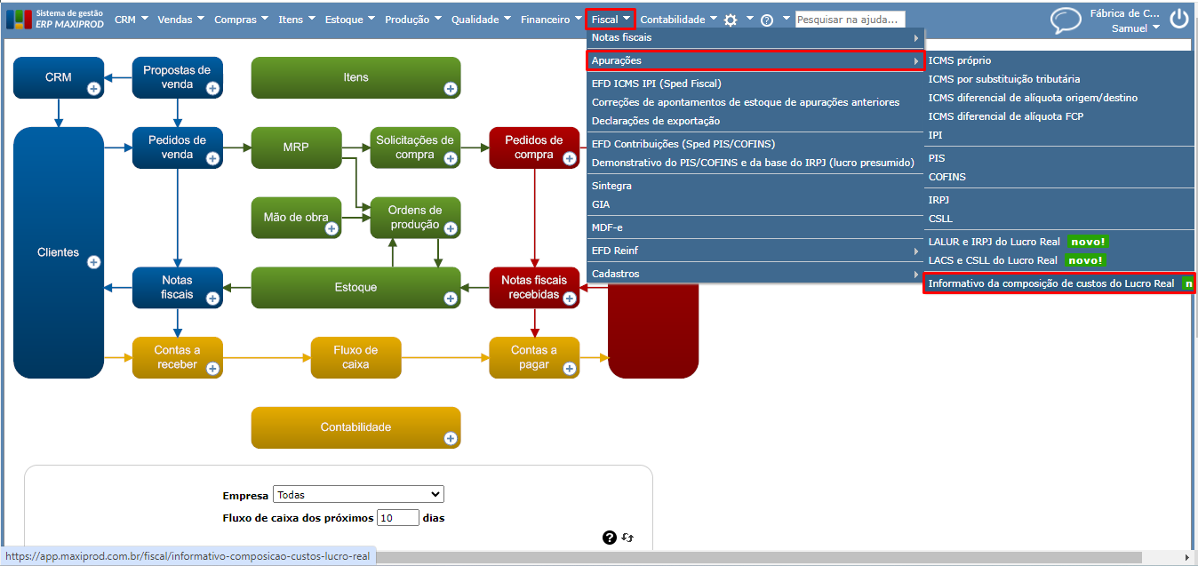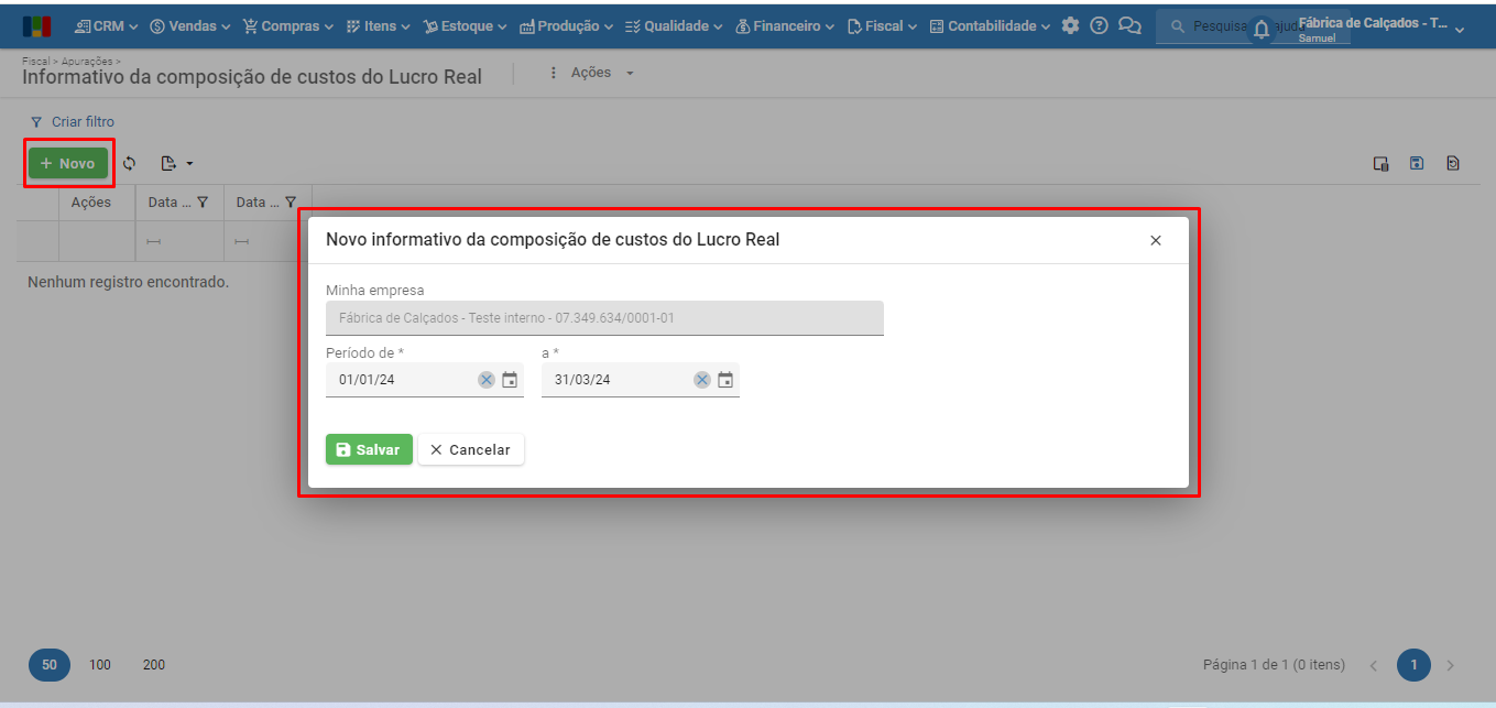 1) Acesse o menu superior “Fiscal > Apurações > Informativo da composição de custos do Lucro Real”.