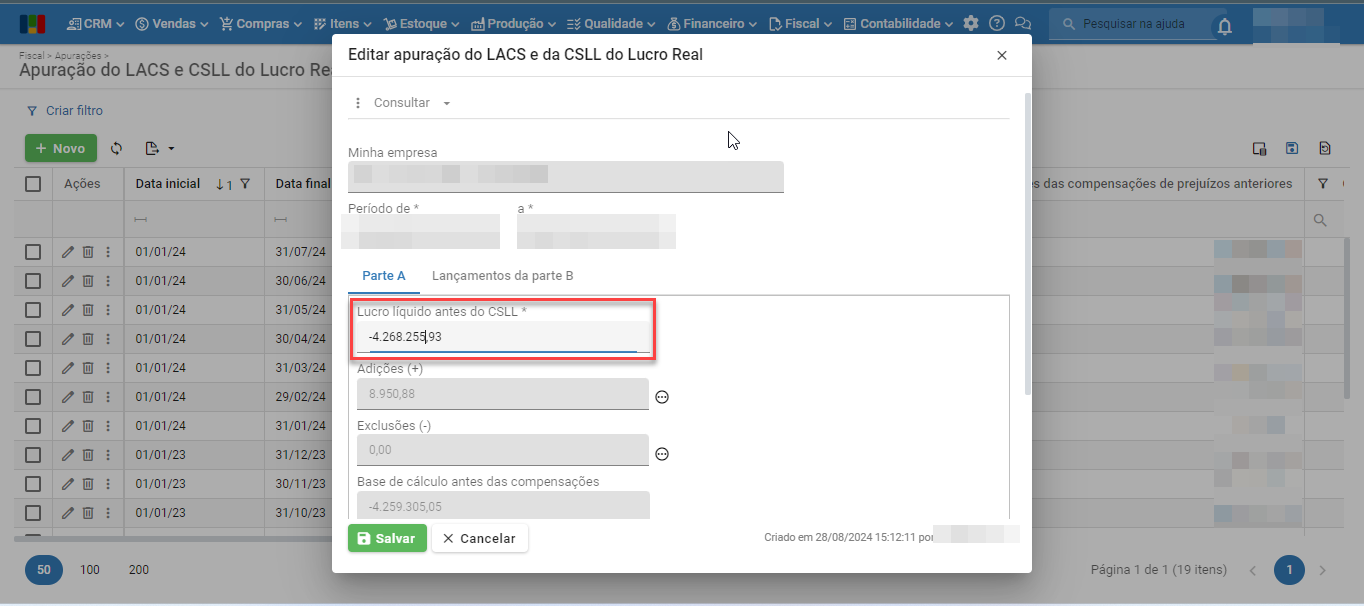 4) Para acessar a edição da apuração, clique no ícone do lapis na grade ou dê um duplo-clique sobre a linha. O campo “Lucro Líquido antes do IRPJ” apresenta o valor do resultado do período obtido através da DRE marcada como “Favorita”, mas pode ser editado pelo usuário.