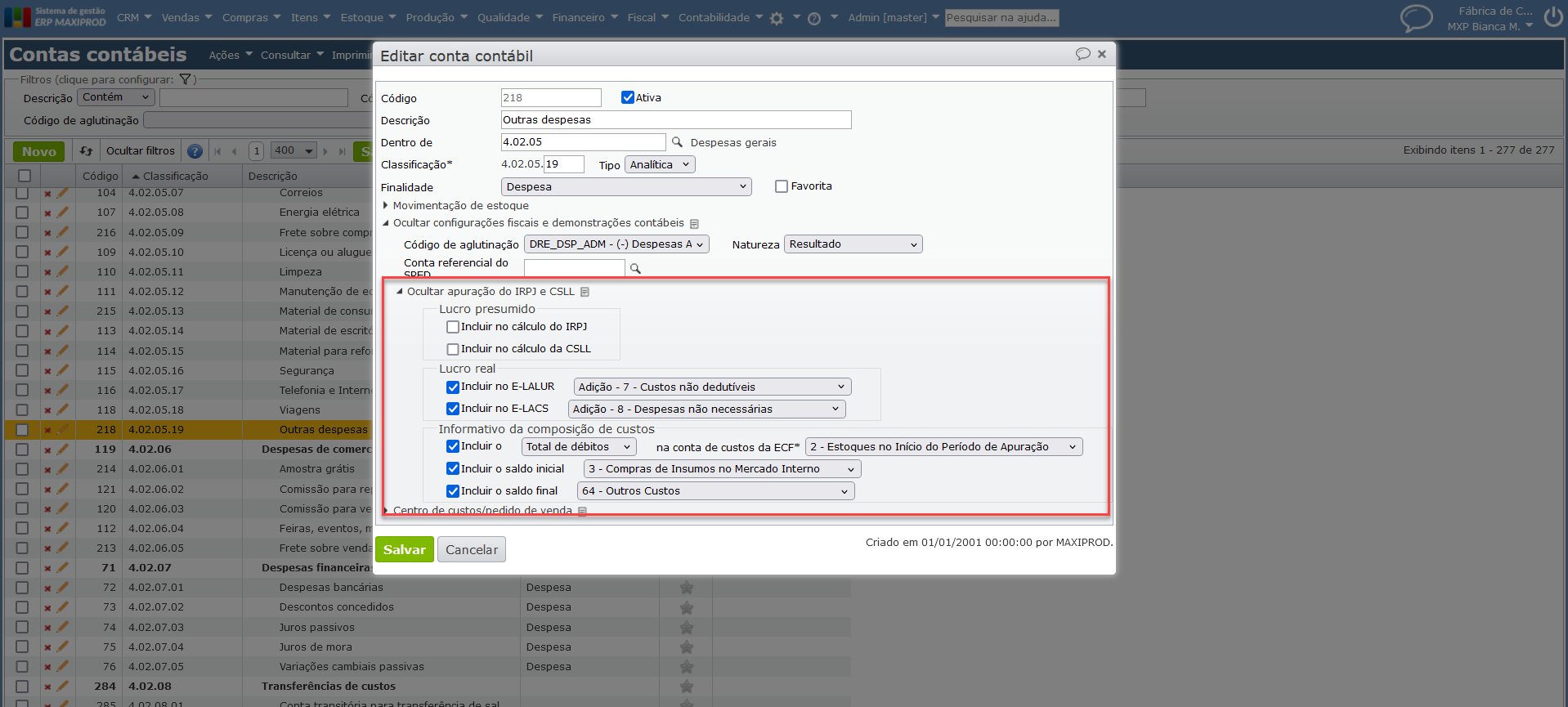 - Configurações para apuração do IRPJ e CSLL nas contas contábeis