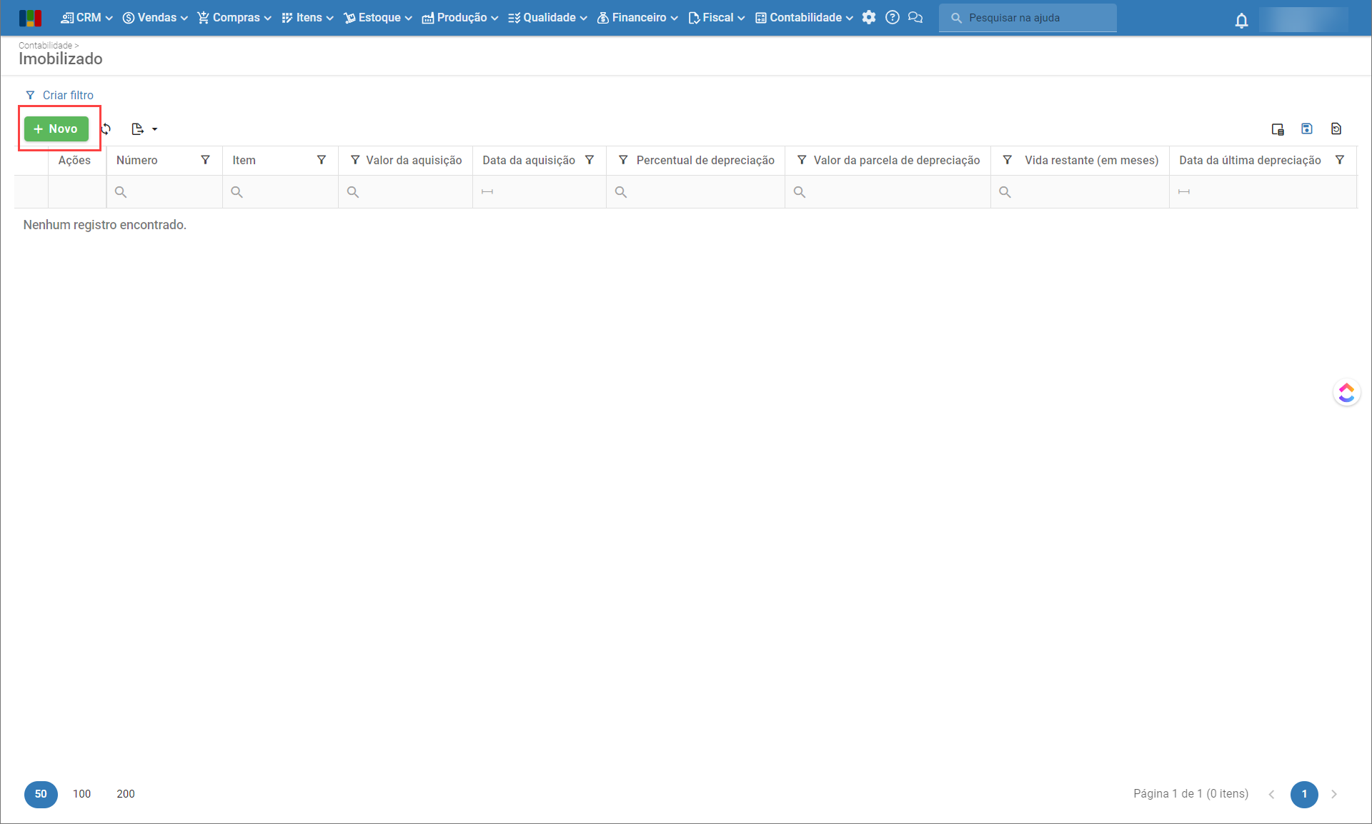 - Data de aquisição: data da compra do imobilizado, utilizada como base no cálculo da depreciação.