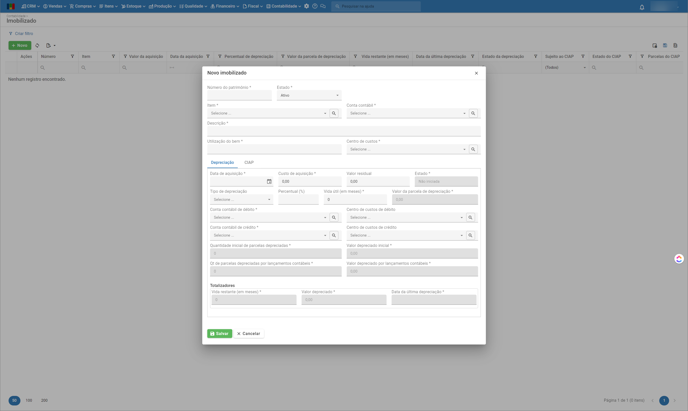- Valor depreciado inicial: valor total já depreciado até o momento de cadastro do imobilizado. Só pode ser editado antes do primeiro lançamento contábil de depreciação.
