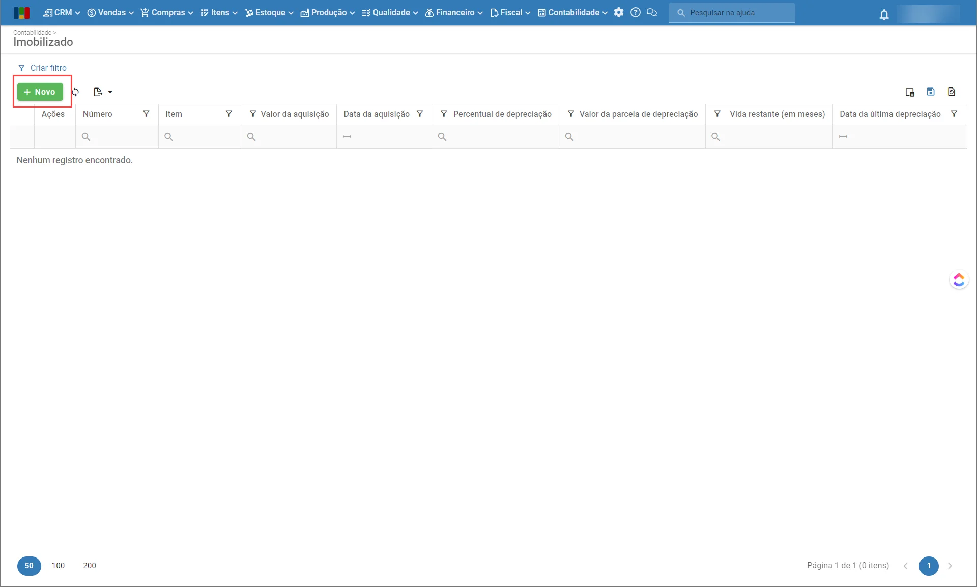 - Data de aquisição: data da compra do imobilizado, utilizada como base no cálculo da depreciação.